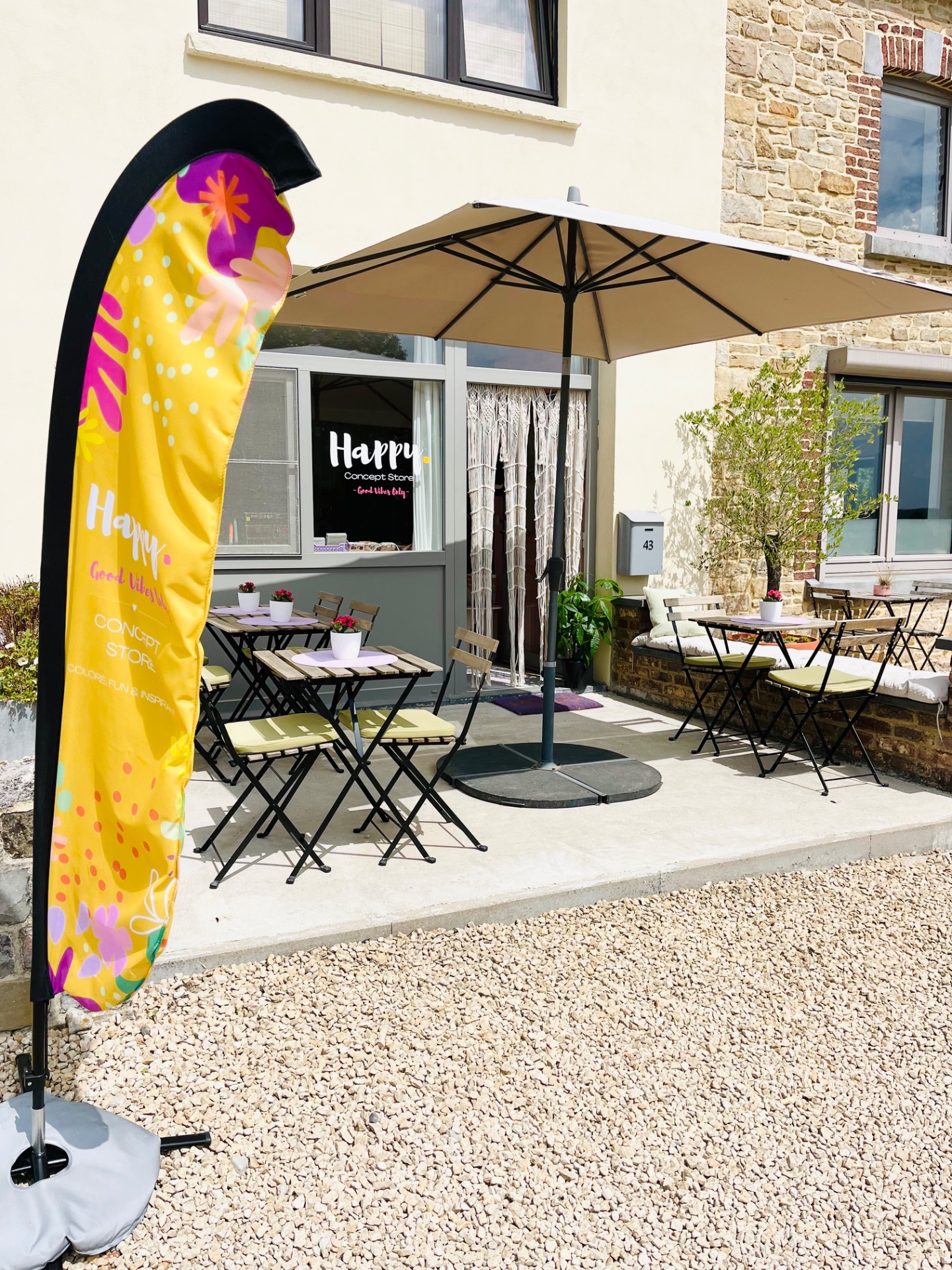 La boutique dispose d'une terrasse ouverte quand le soleil est là, un espace pour te poser, chiller, profiter de déguster une tisane, un thé, un sirop, un café ou de déguster un Happy Bowl, les goûters de la boutique, fait par mes soins avec des produits locaux, des yaourts de la ferme, des fruits de saisons, du granola vendu en boutique,... l'été je te propose aussi des glaces individuelles de la ferme, de quoi te régaler!