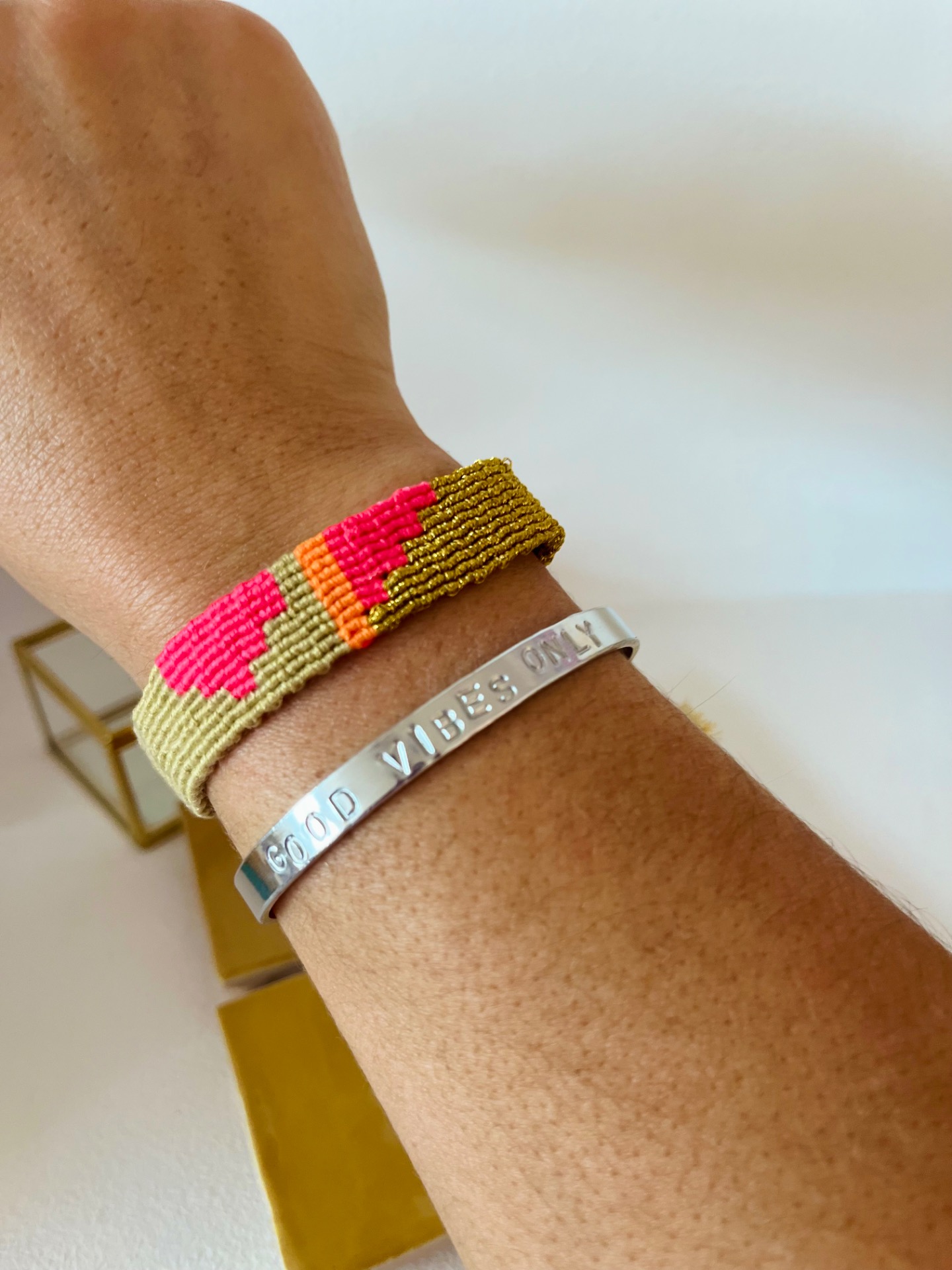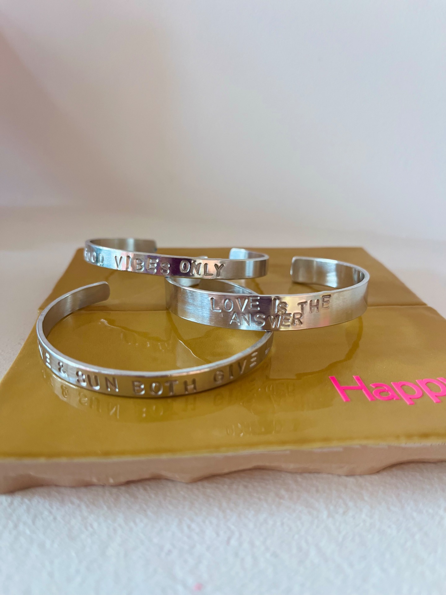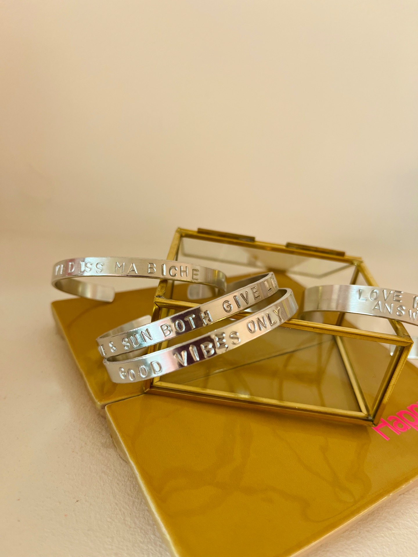 Bracelet mantra en argent aluminium, gravés de jolis mots à porter pour t'amener plein de good vibes.