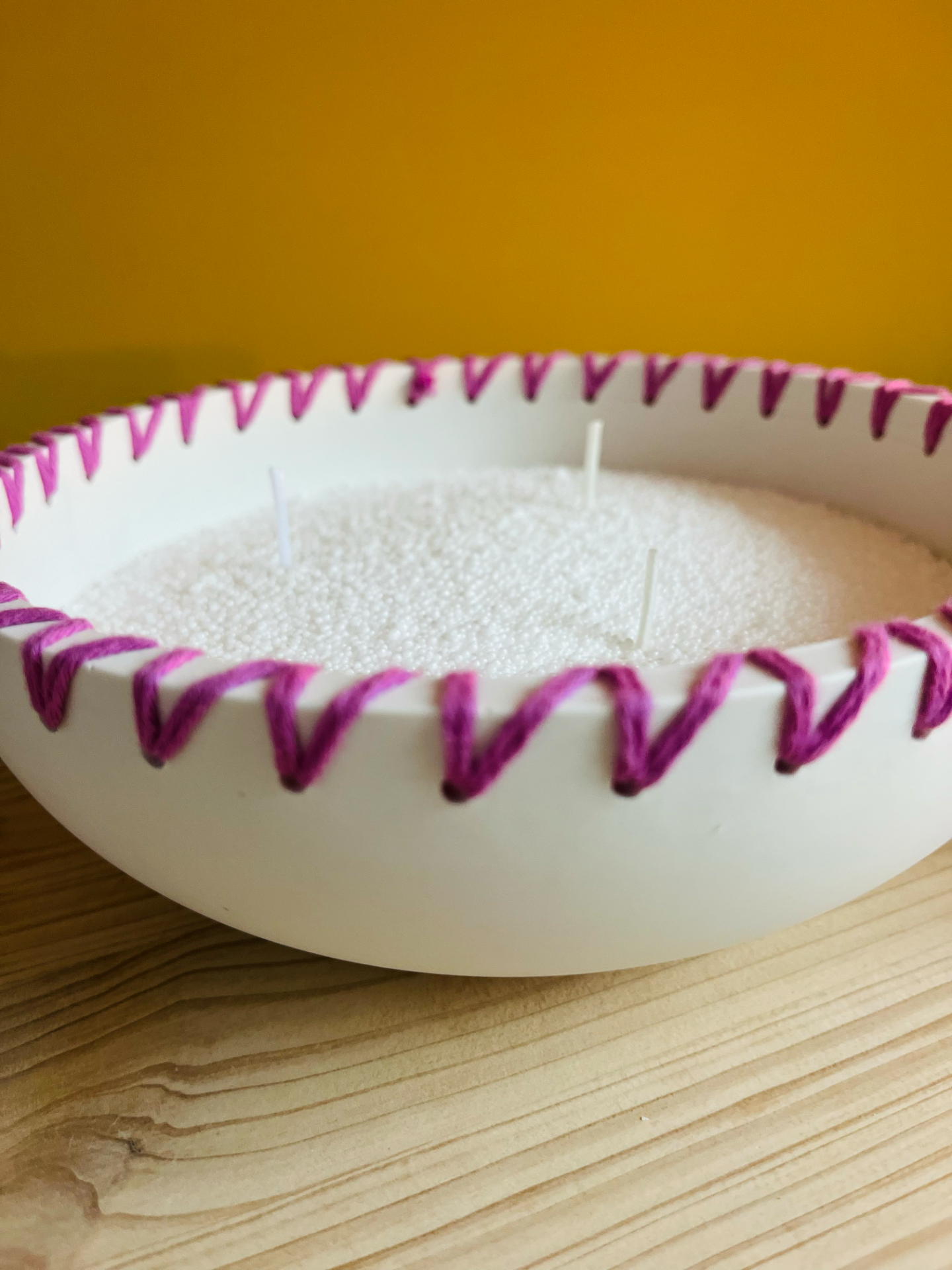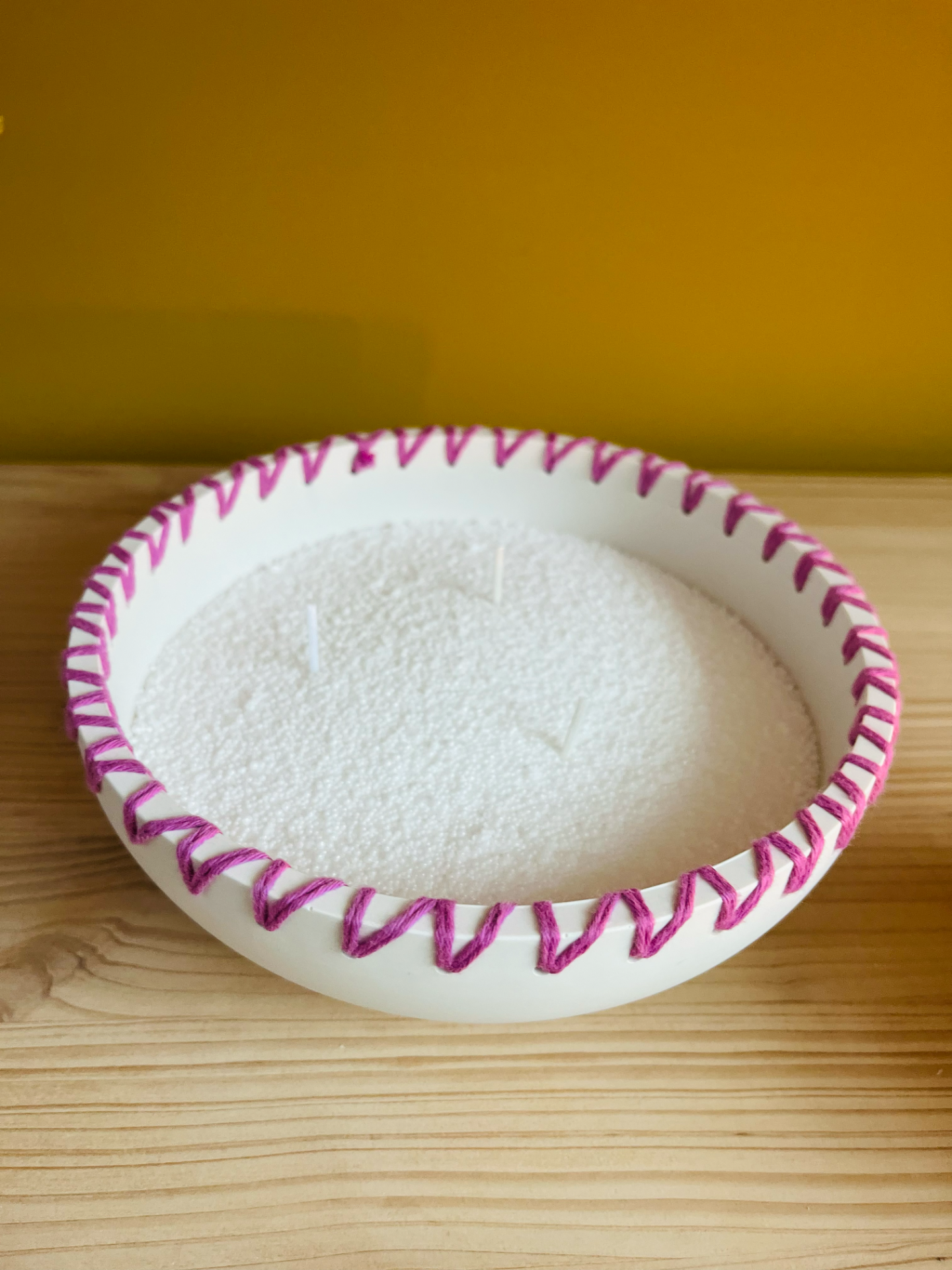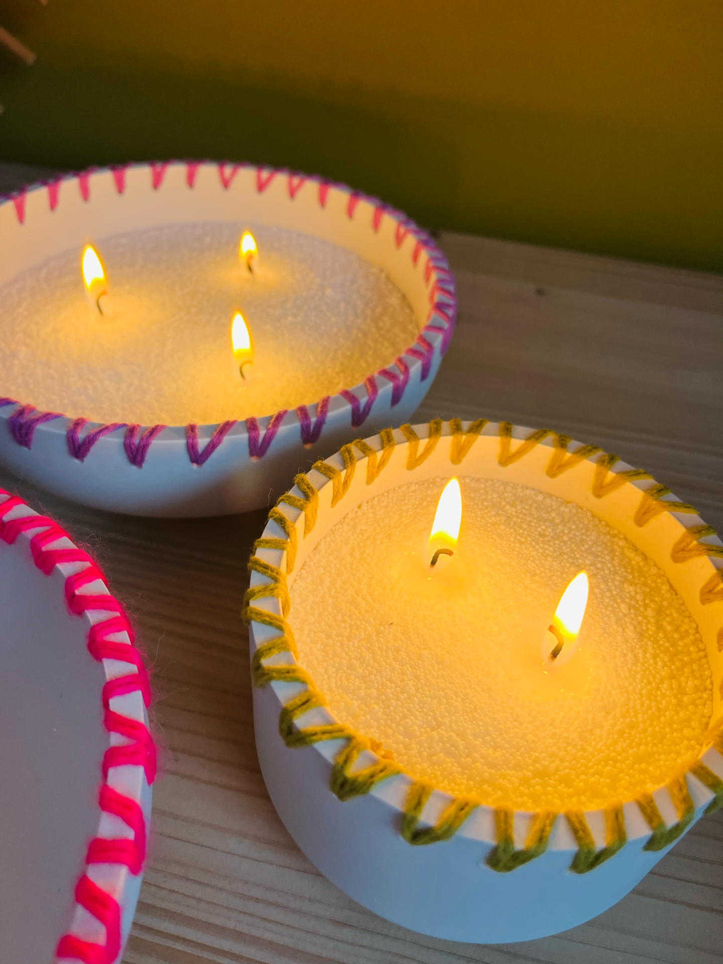 Jolie bougie 3 mèches réalisée à la main en Jesmonite, résine éco responsable, décorée de joli laine colorée pour un look unique, à remplir avec le sable de bougie, une cire en grain fabriquée de 100% de matières végétales et naturelles, sans paraffine.