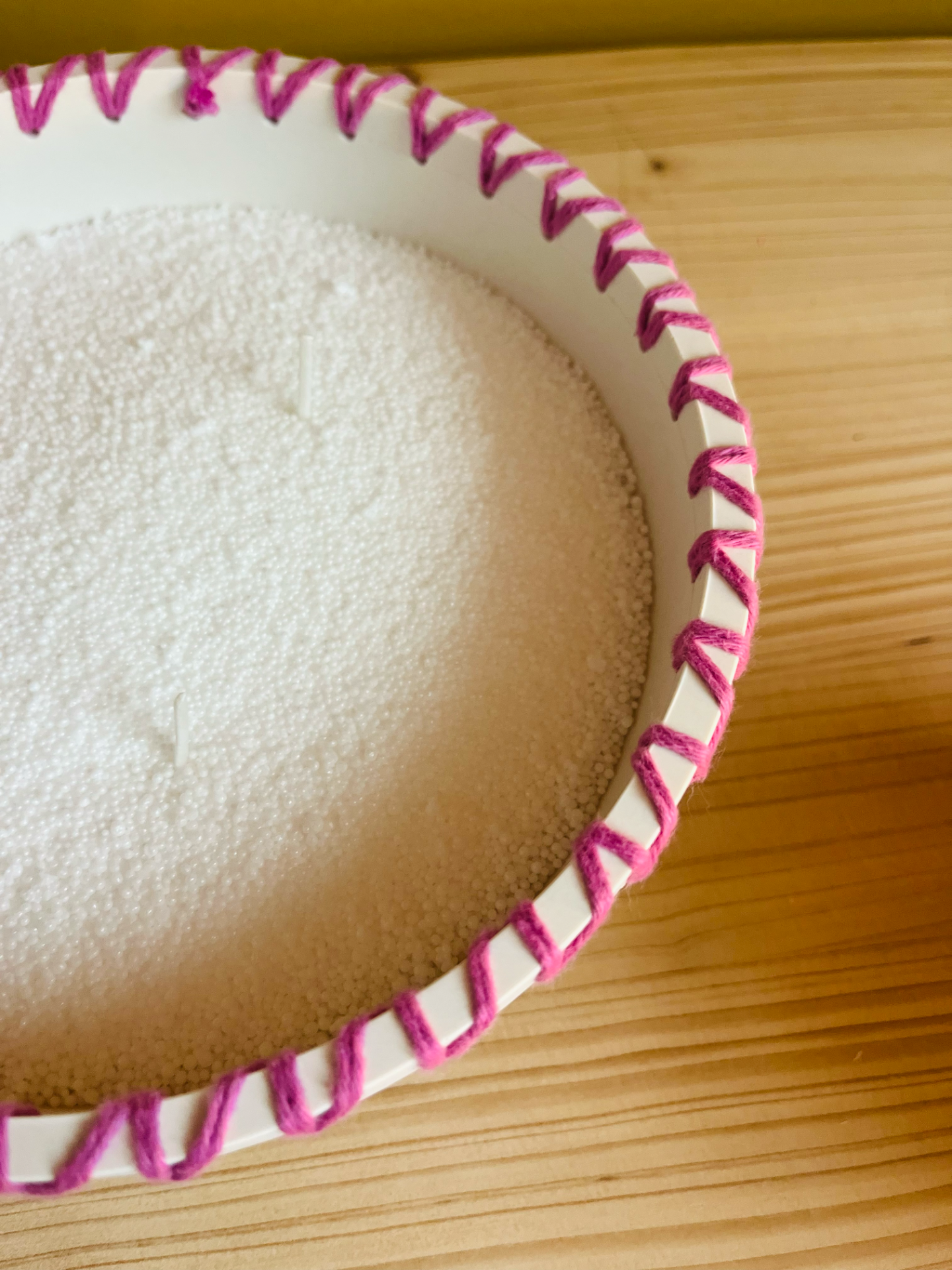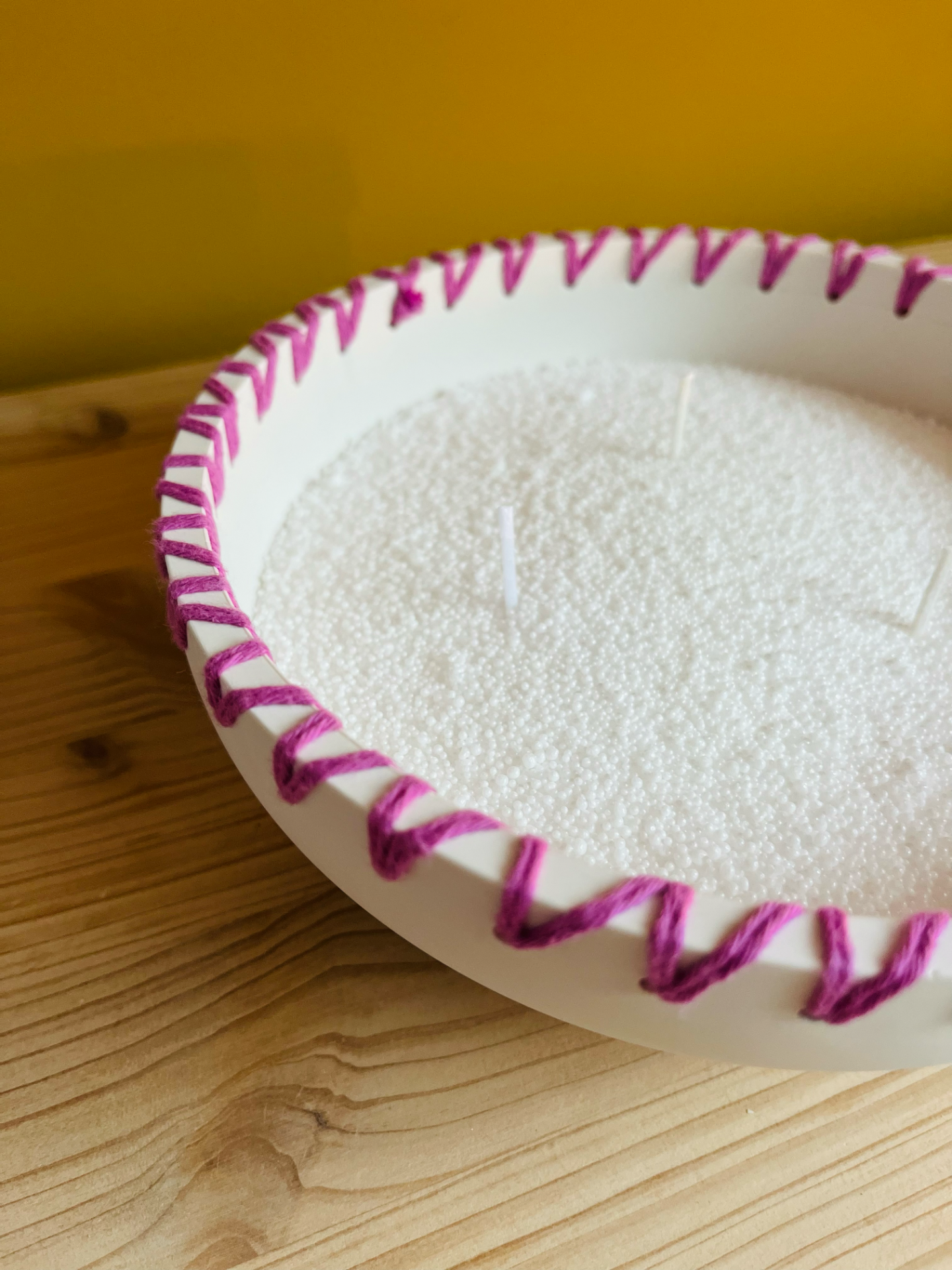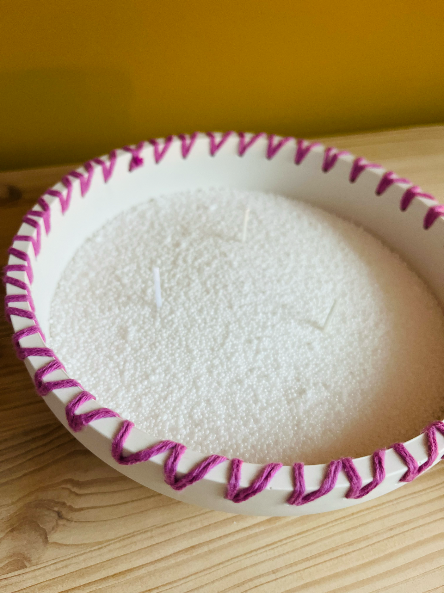 Jolie bougie 3 mèches réalisée à la main en Jesmonite, résine éco responsable, décorée de joli laine colorée pour un look unique, à remplir avec le sable de bougie, une cire en grain fabriquée de 100% de matières végétales et naturelles, sans paraffine.