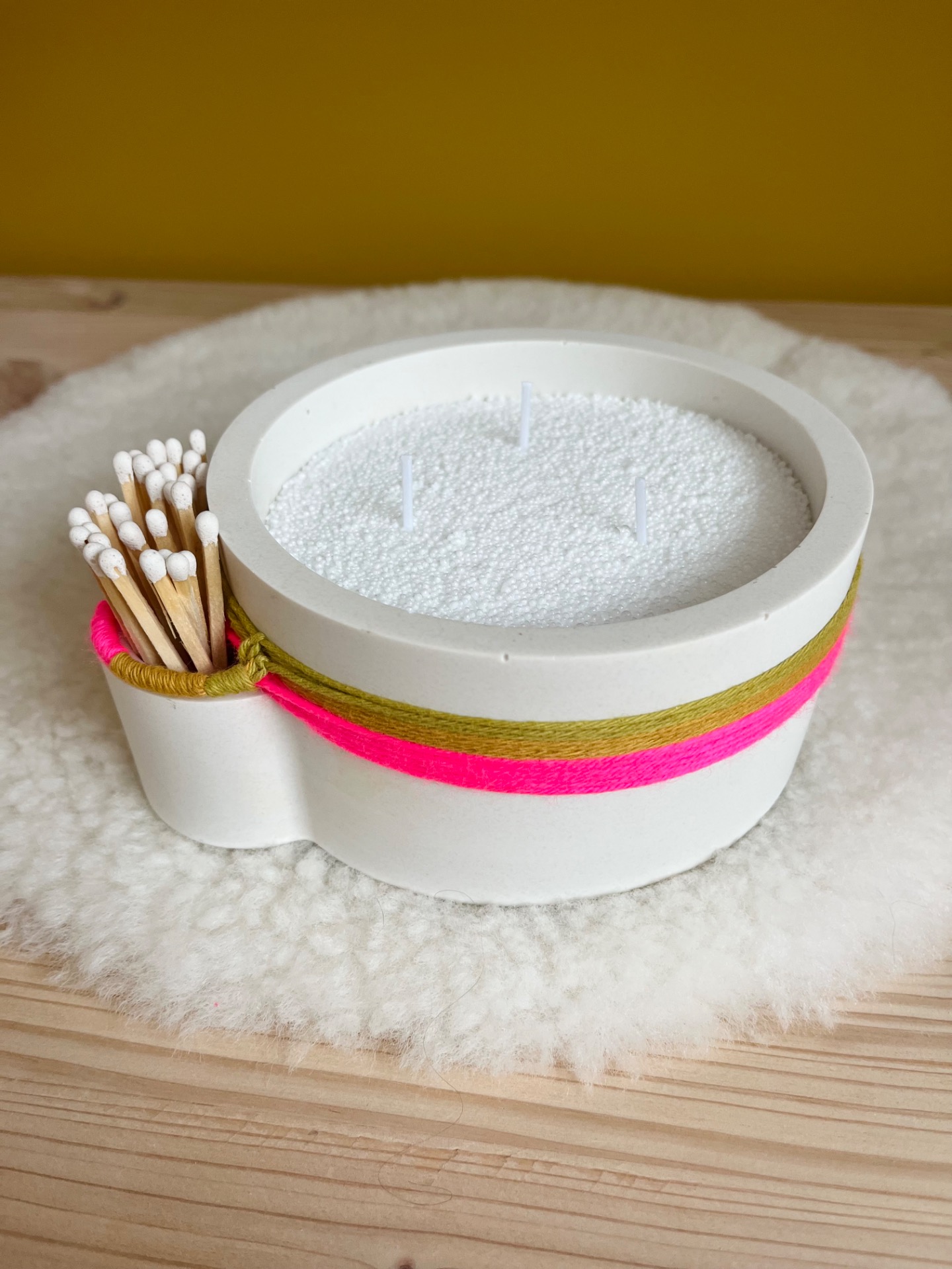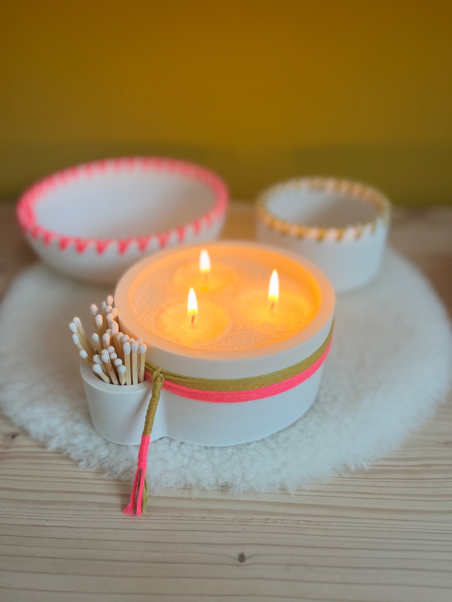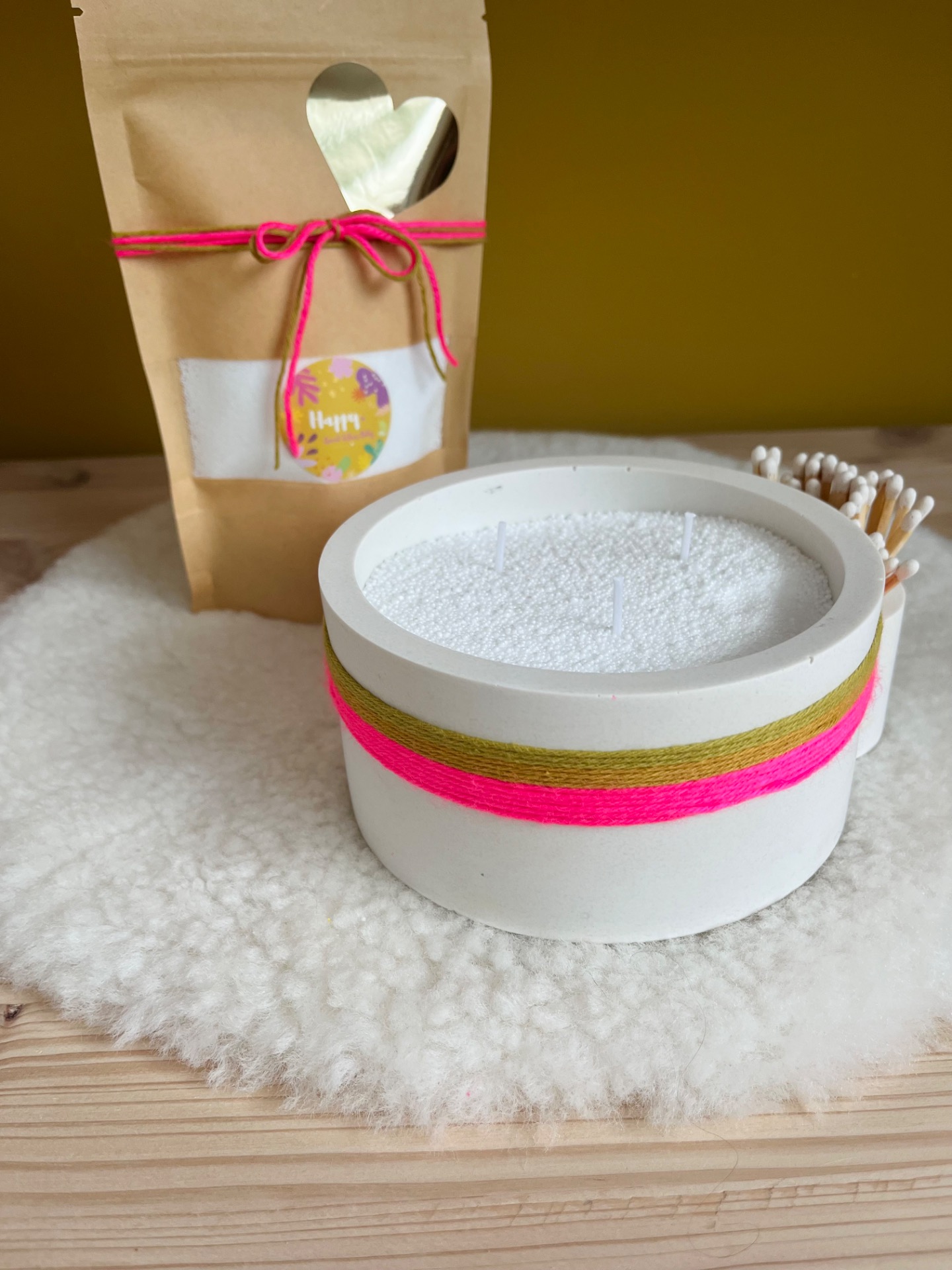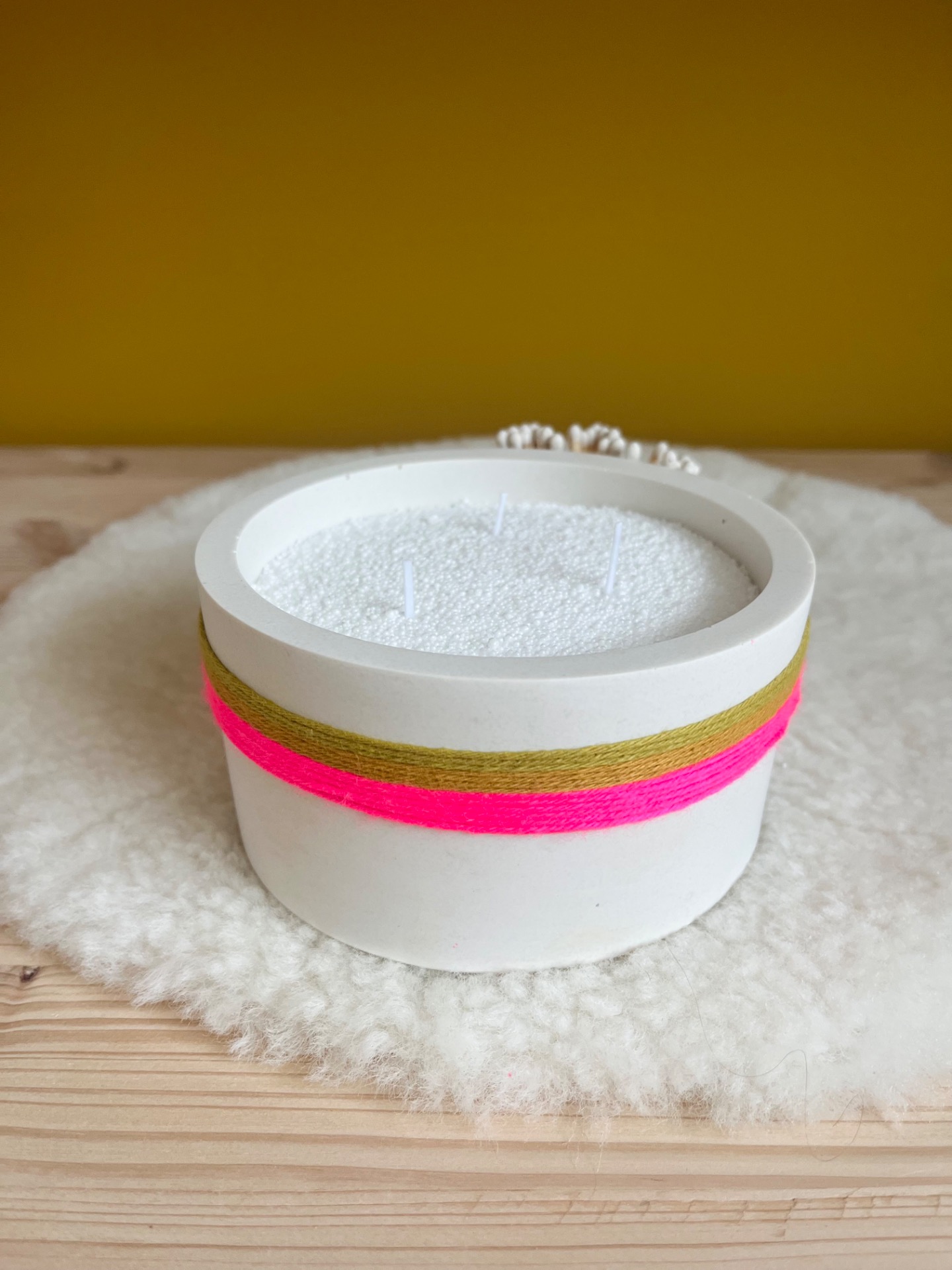 Jolie bougie 3 mèches réalisée à la main en Jesmonite, résine éco responsable, décorée de joli laine colorée pour un look unique, à remplir avec le sable de bougie, une cire en grain fabriquée de 100% de matières végétales et naturelles, sans paraffine.