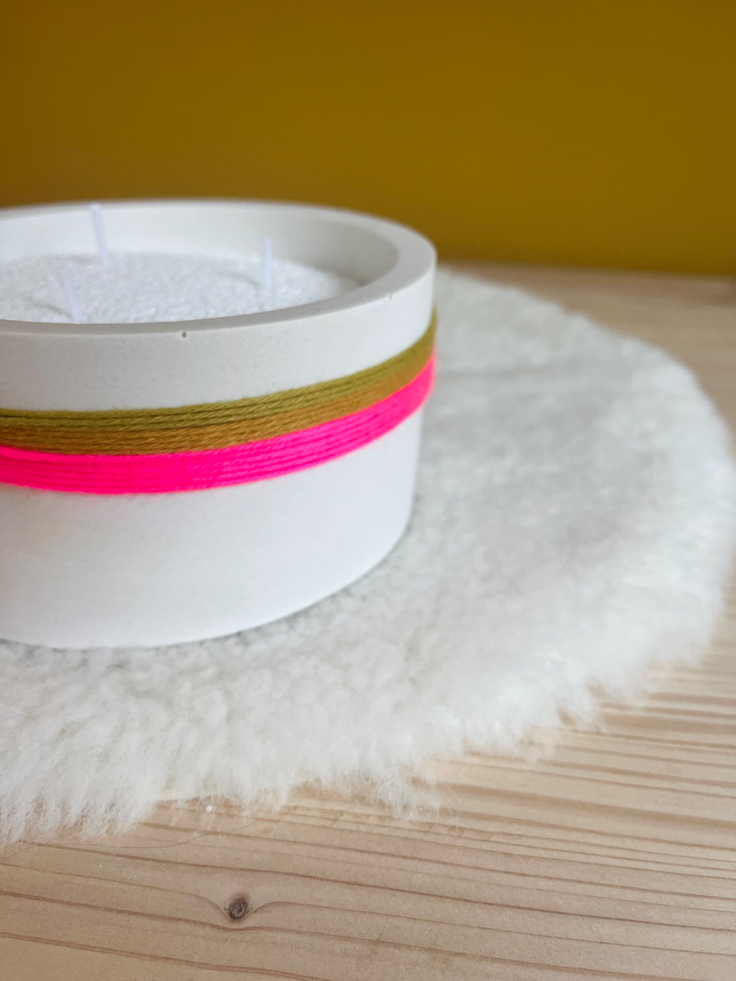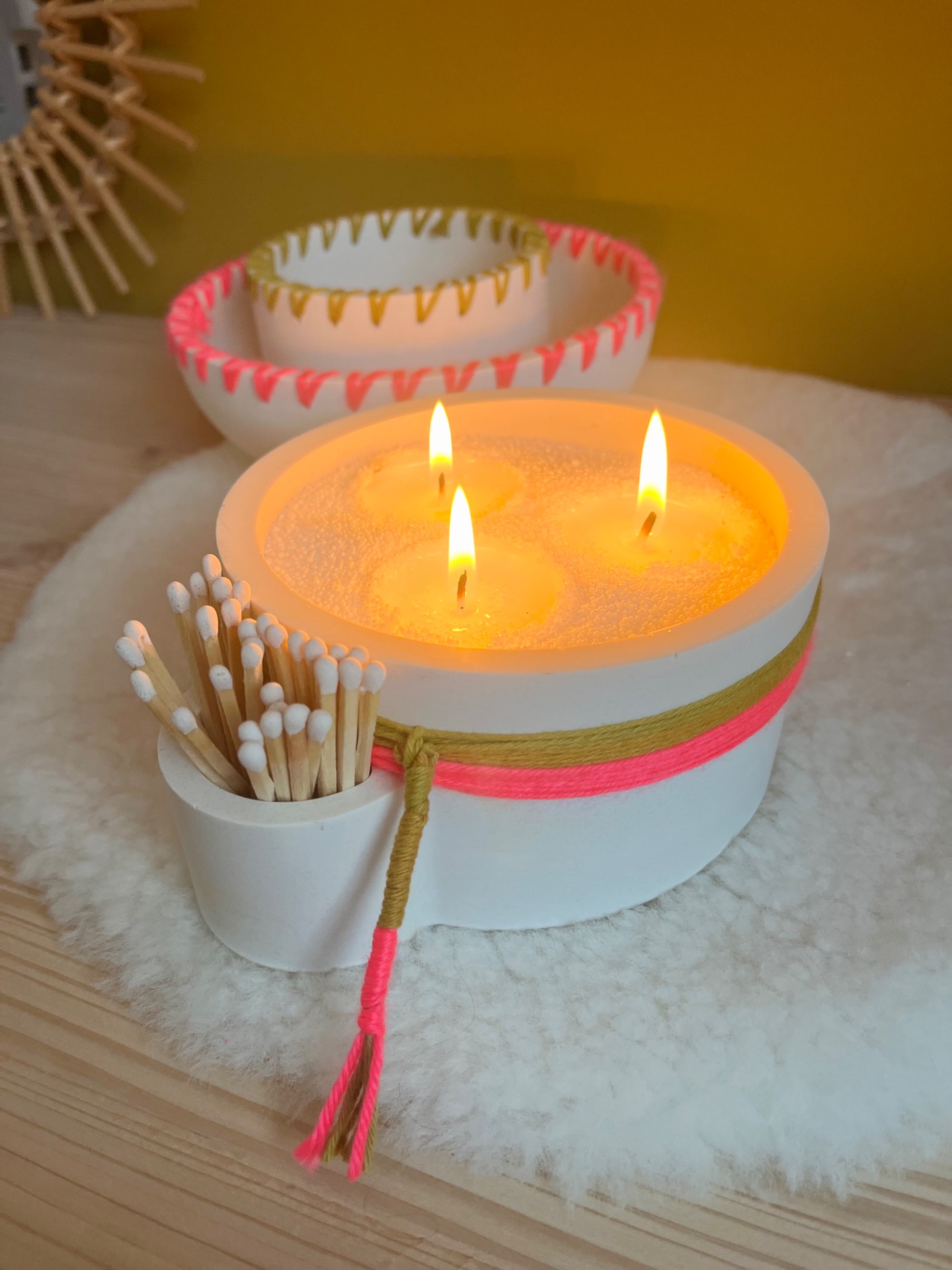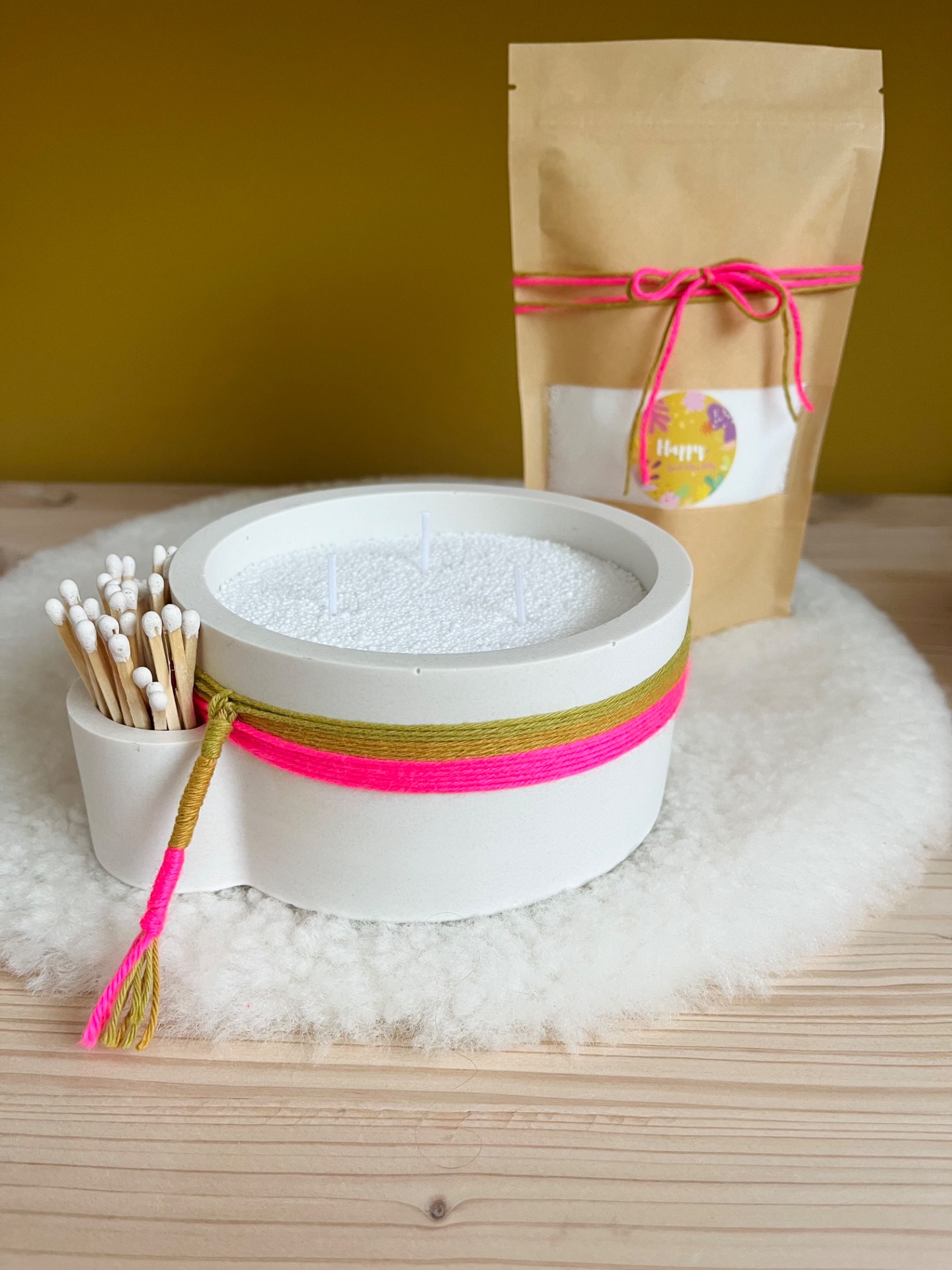 Jolie bougie 3 mèches réalisée à la main en Jesmonite, résine éco responsable, décorée de joli laine colorée pour un look unique, à remplir avec le sable de bougie, une cire en grain fabriquée de 100% de matières végétales et naturelles, sans paraffine.