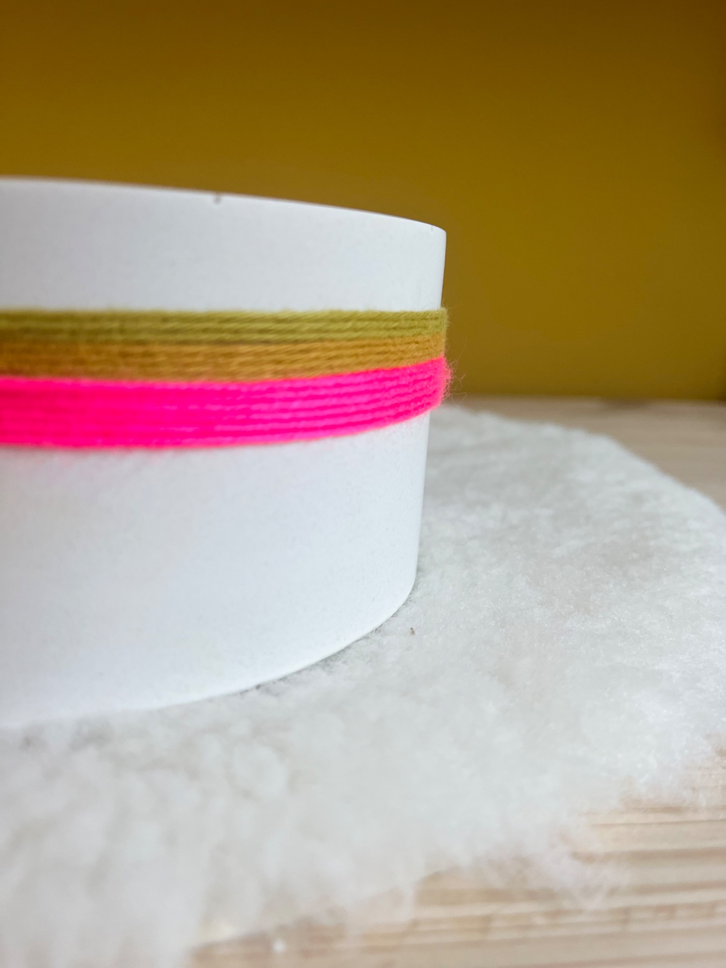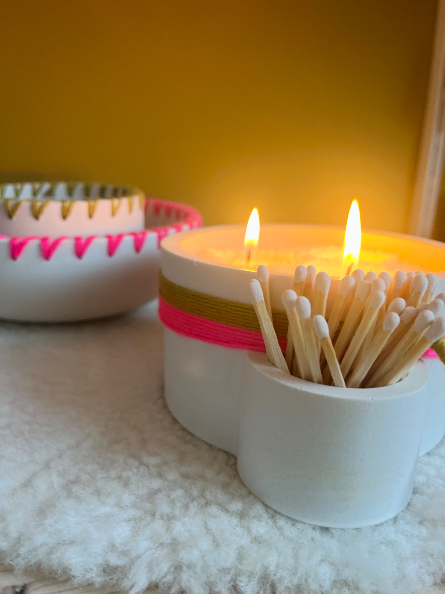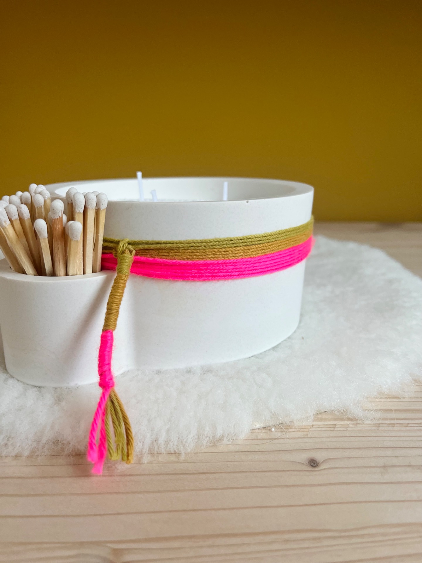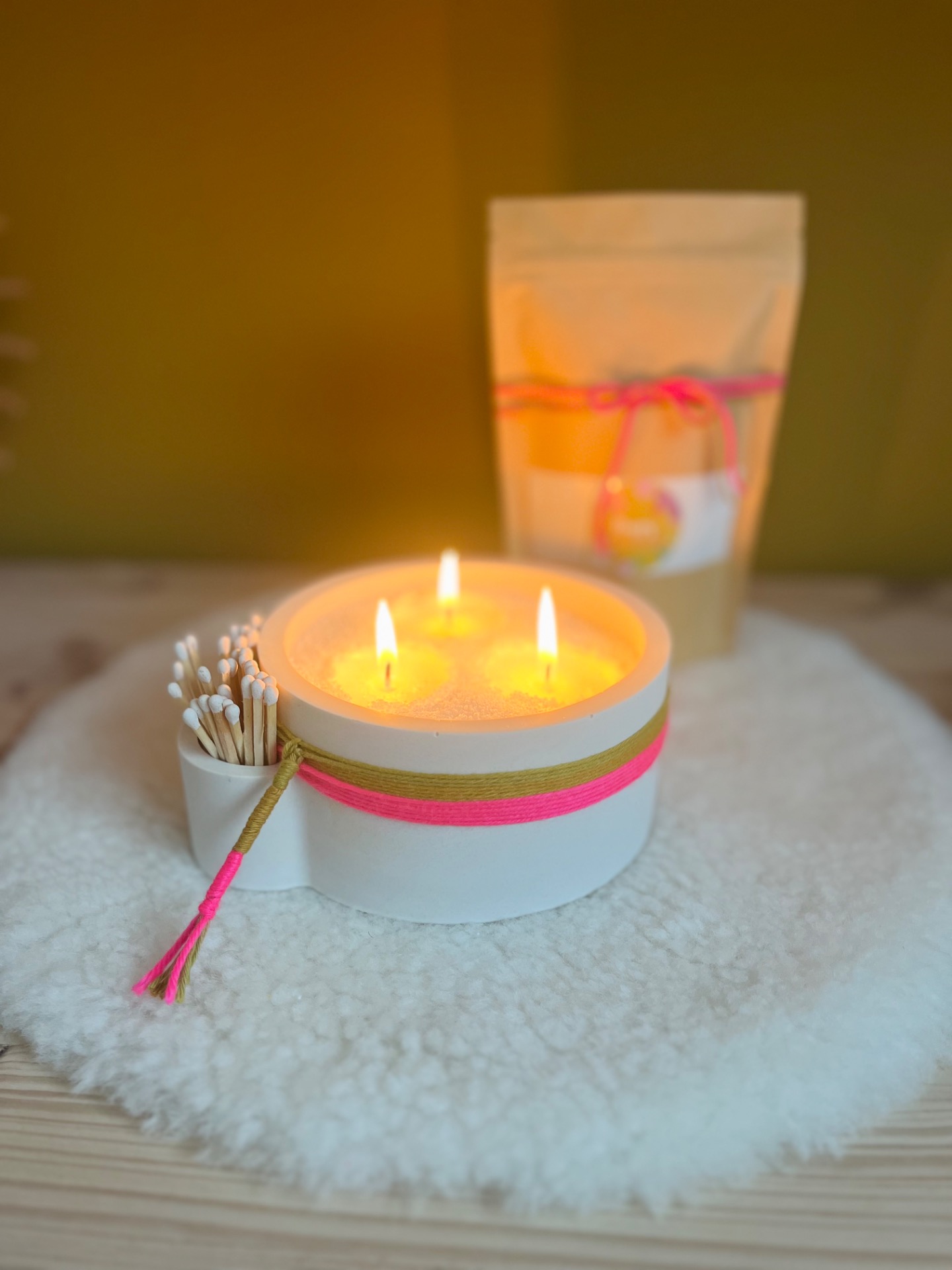 Jolie bougie 3 mèches réalisée à la main en Jesmonite, résine éco responsable, décorée de joli laine colorée pour un look unique, à remplir avec le sable de bougie, une cire en grain fabriquée de 100% de matières végétales et naturelles, sans paraffine.