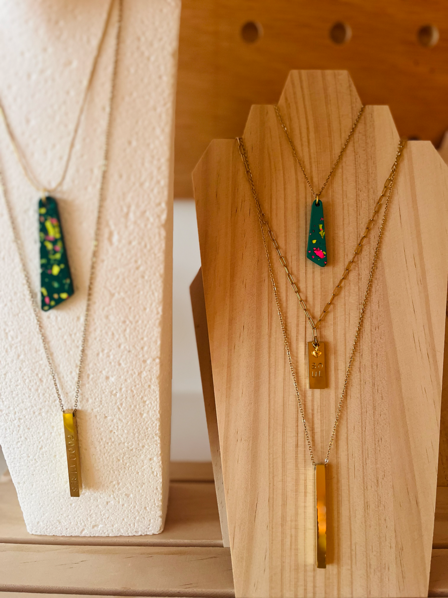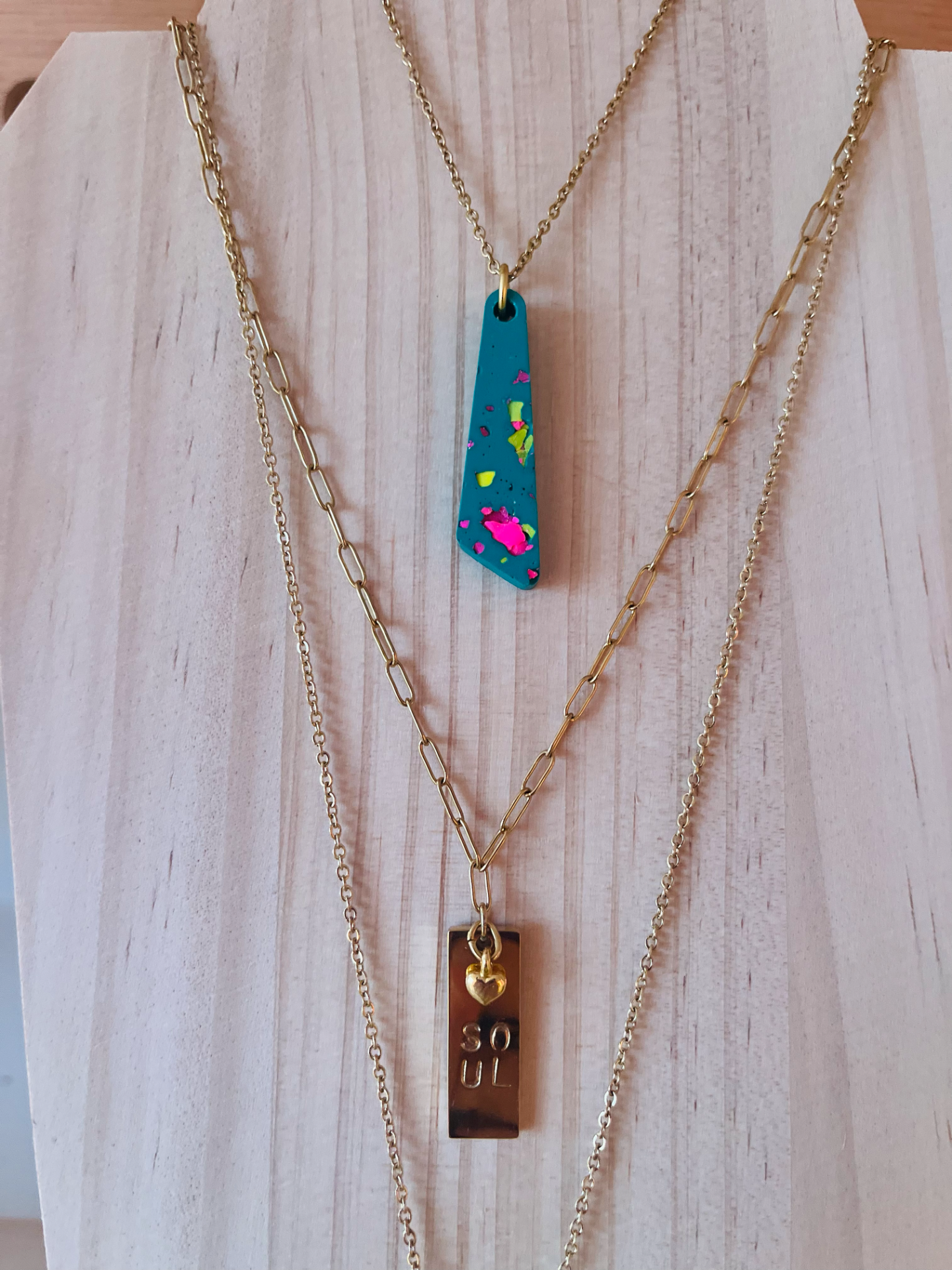 Collier en jesmonite, résine éco-responsable, sans produits chimiques, ni solvants, good pour la planète.