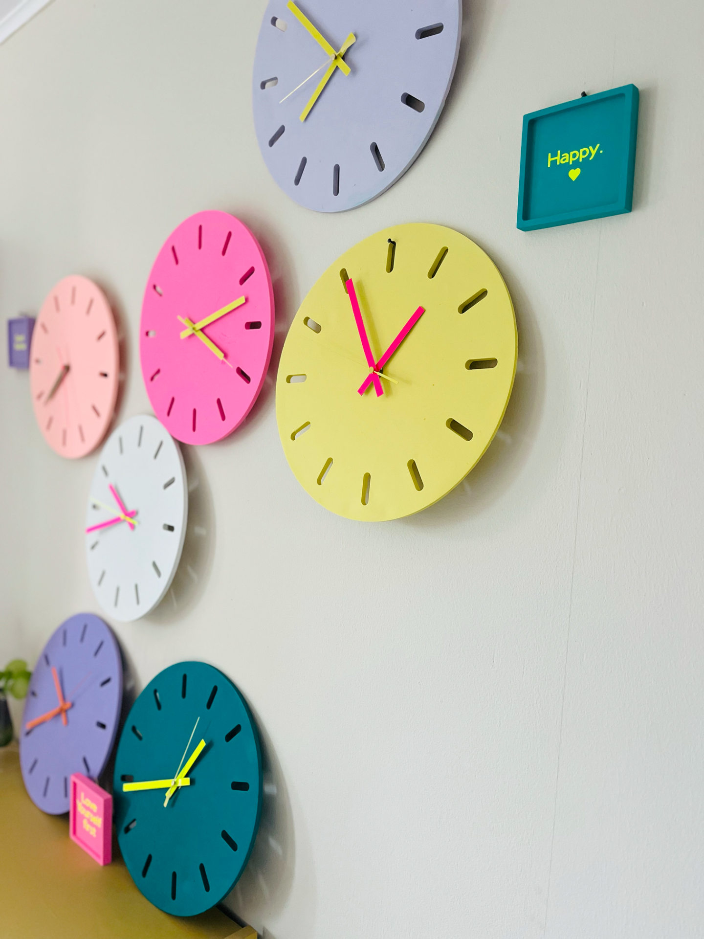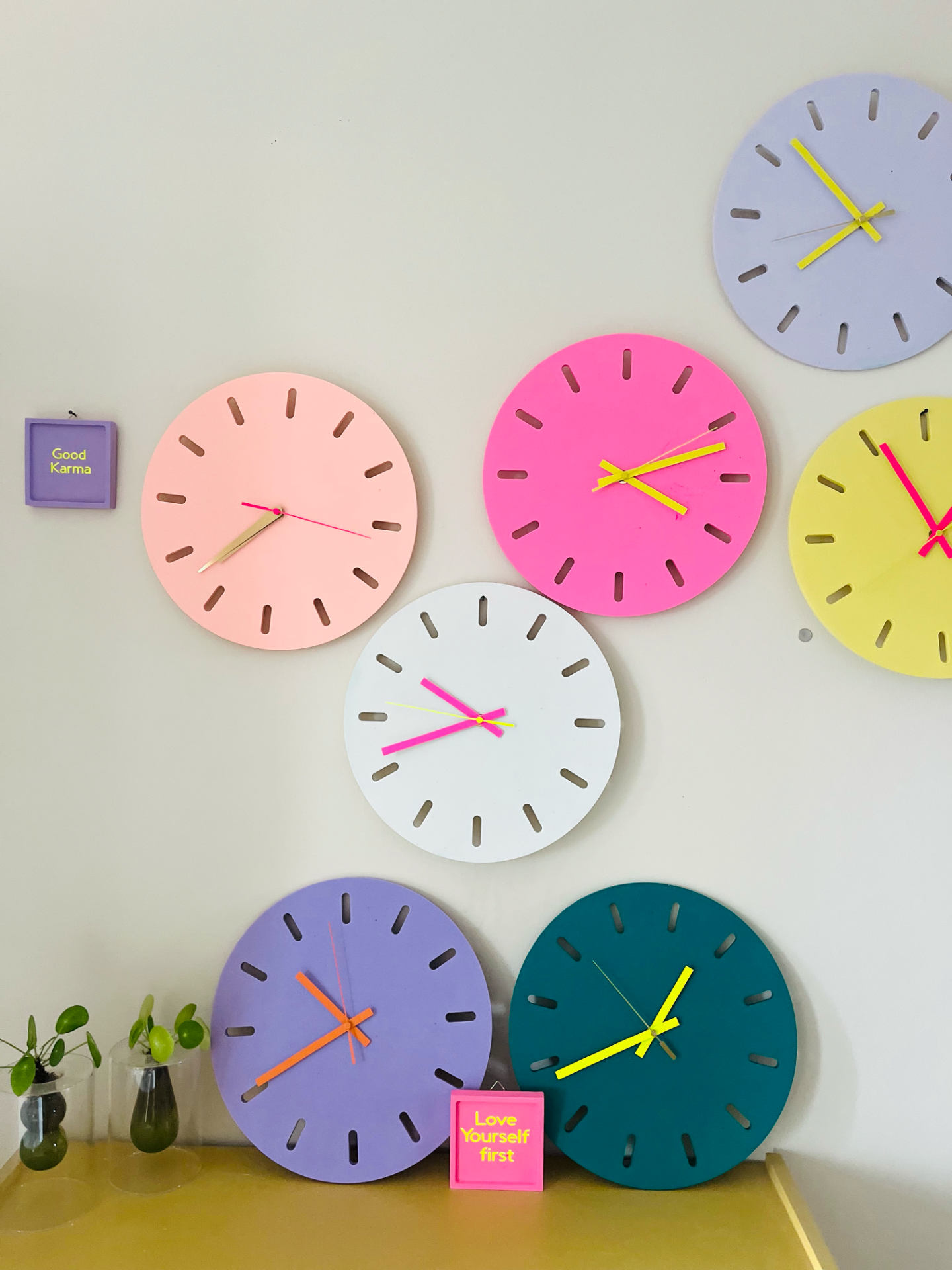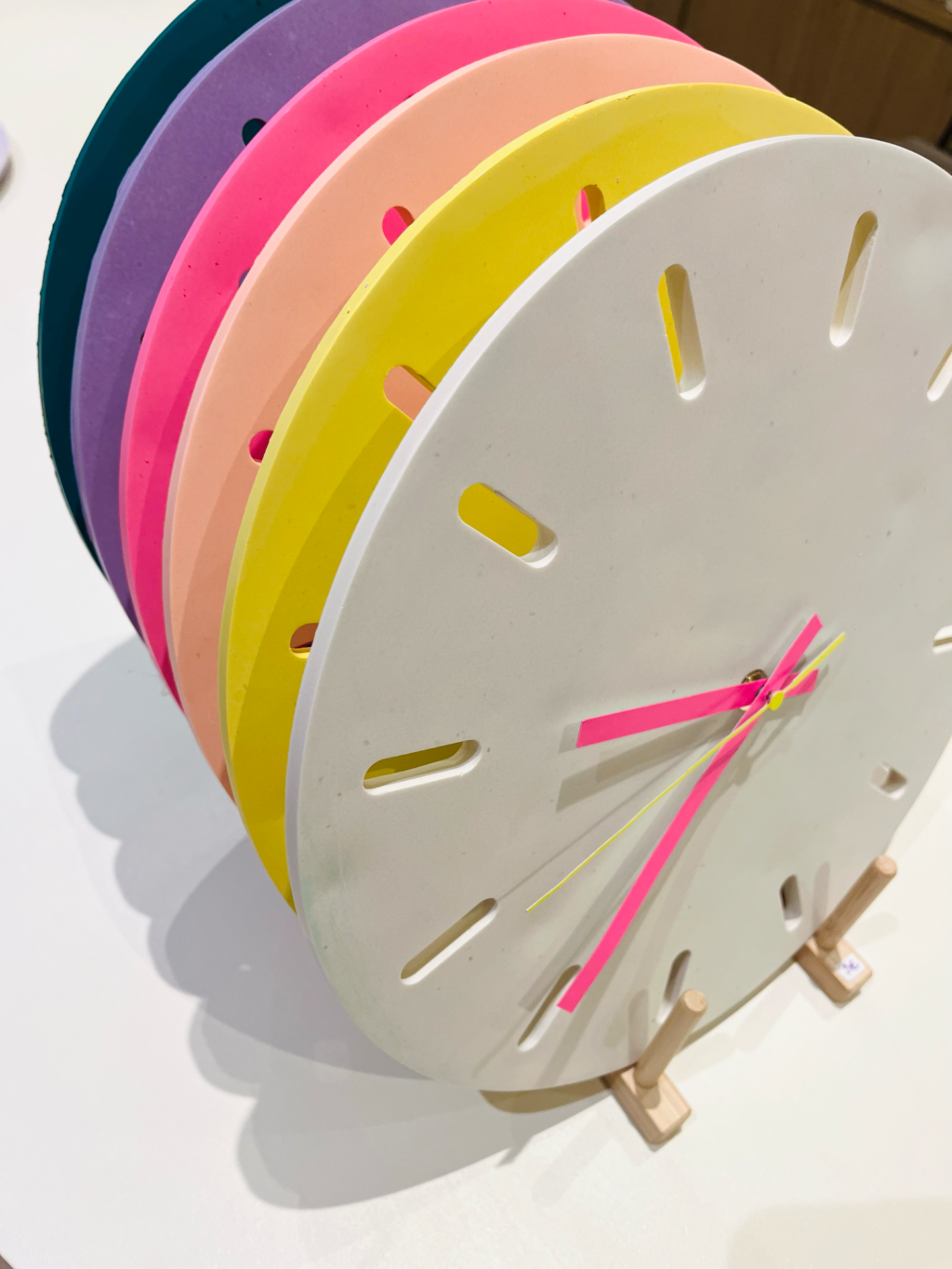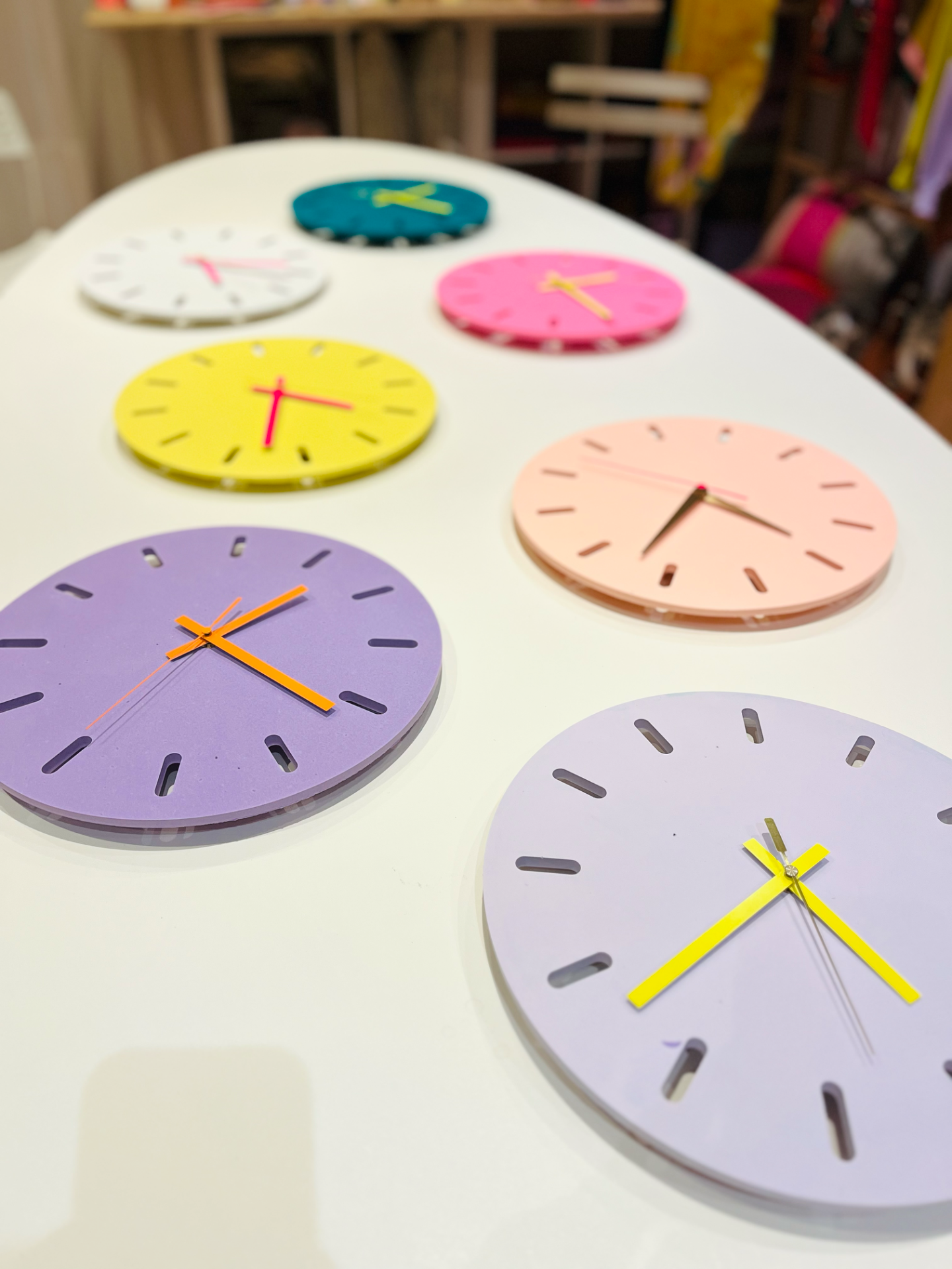 Horloge réalisée à la main en Jesmonite, une résine éco responsable, couleur mauve, aiguilles oranges.