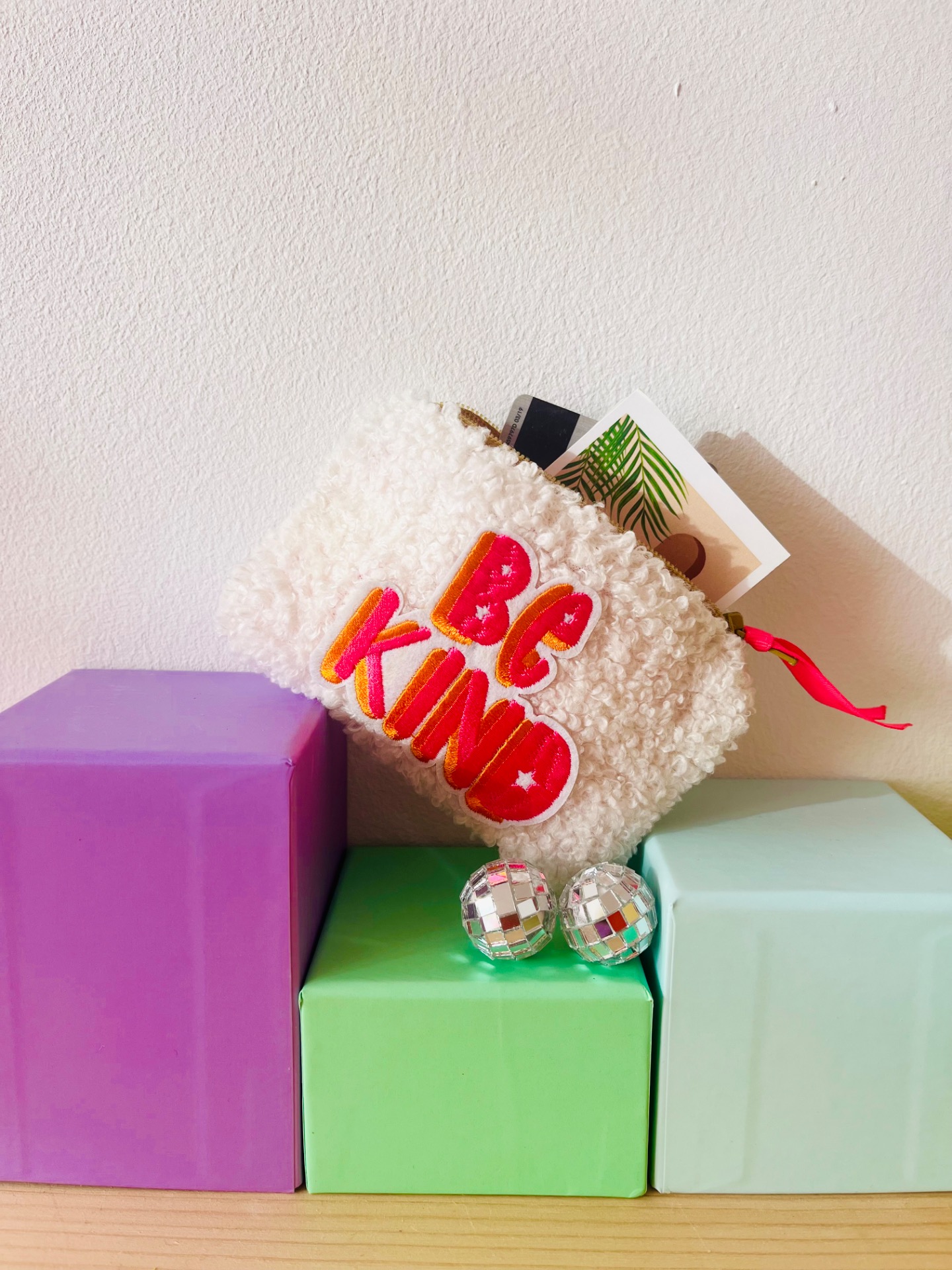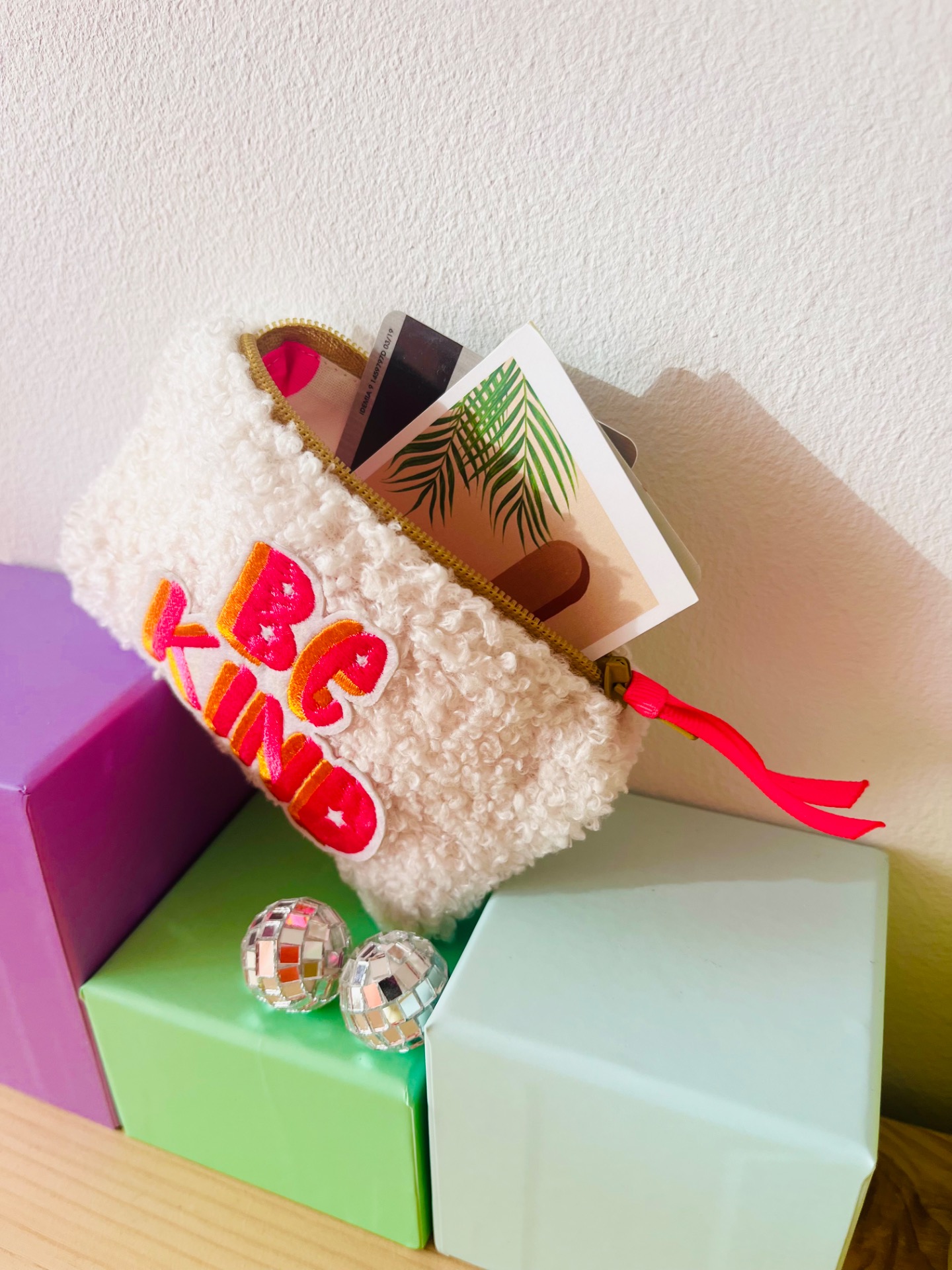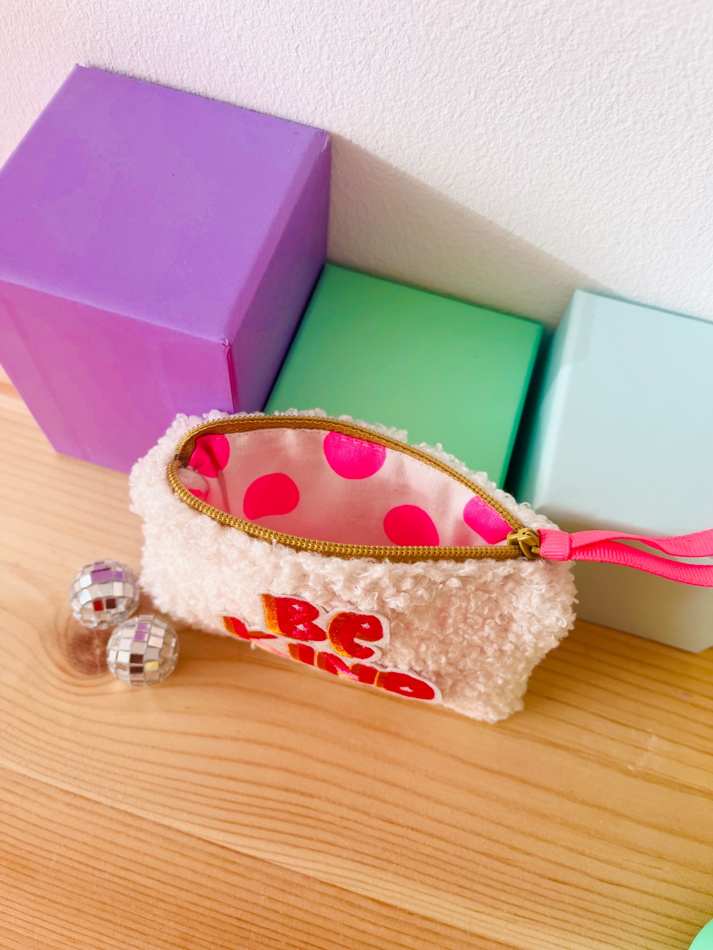 Petite trousse faite à la main avec amour, en tissu sherpa/ teddy, doublée d'un tissu coton coloré et d'une fermeture éclaire, un patch plein de good vibes est collé et cousu dessus.