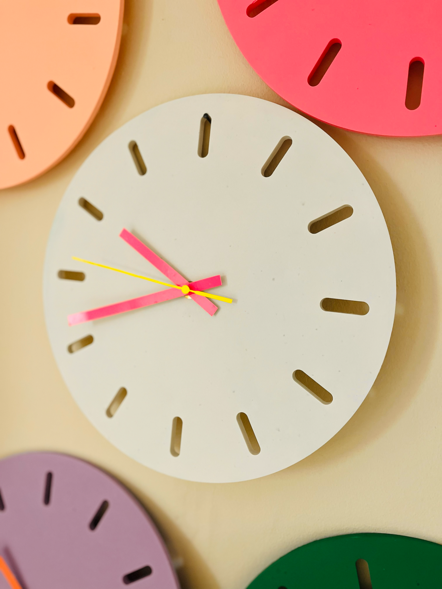 Horloge réalisée à la main en Jesmonite, une résine éco responsable, couleur blanc cassé, aiguilles rose fluo.