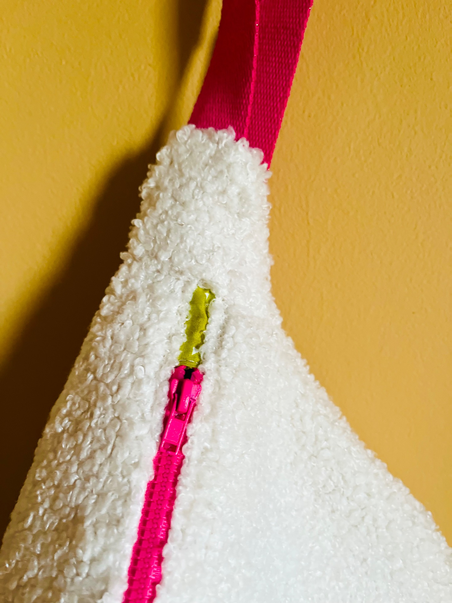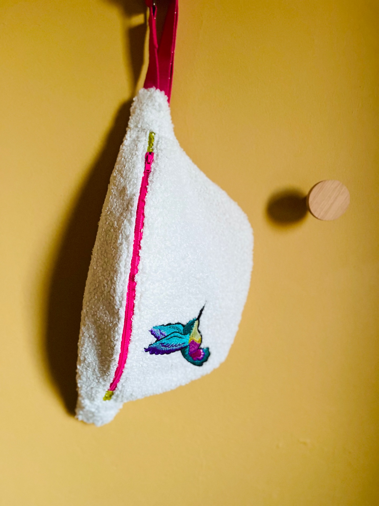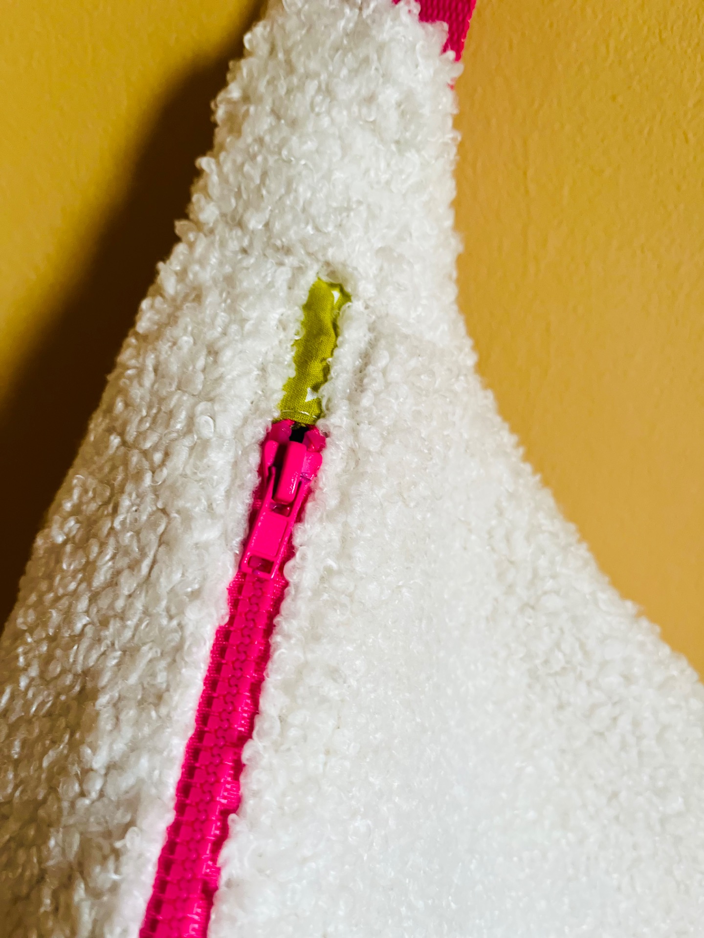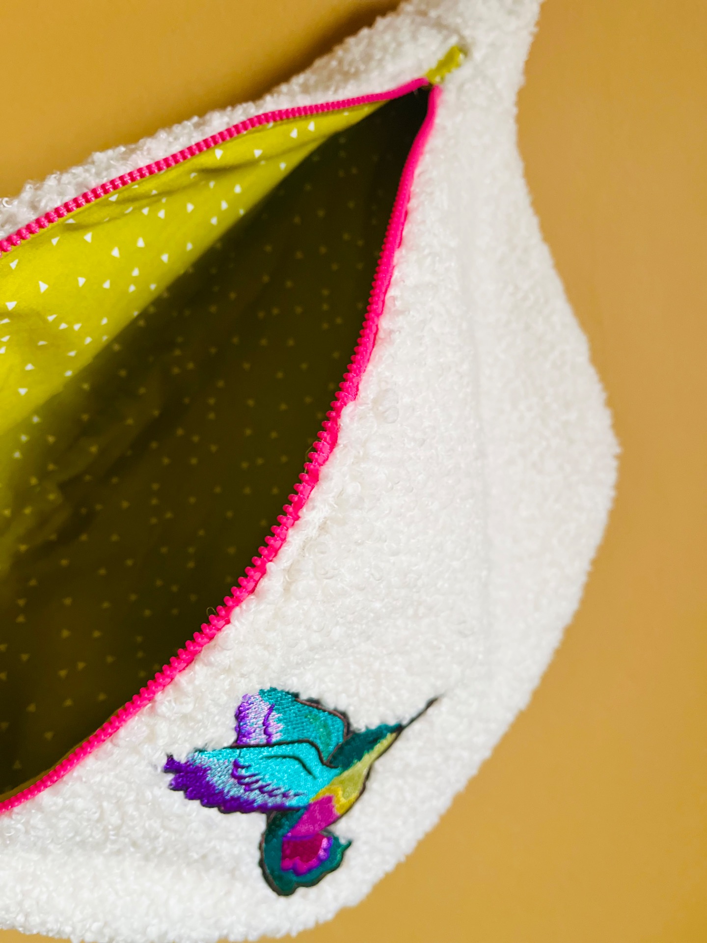 Sac banane en tissu bouclette, un look unique et stylé, de jolis détails sur cette banane, une fermeture éclair rose fluo, doublée d’un tissu vert anis a petits triangles blancs, il est stylé même de l’intérieur!