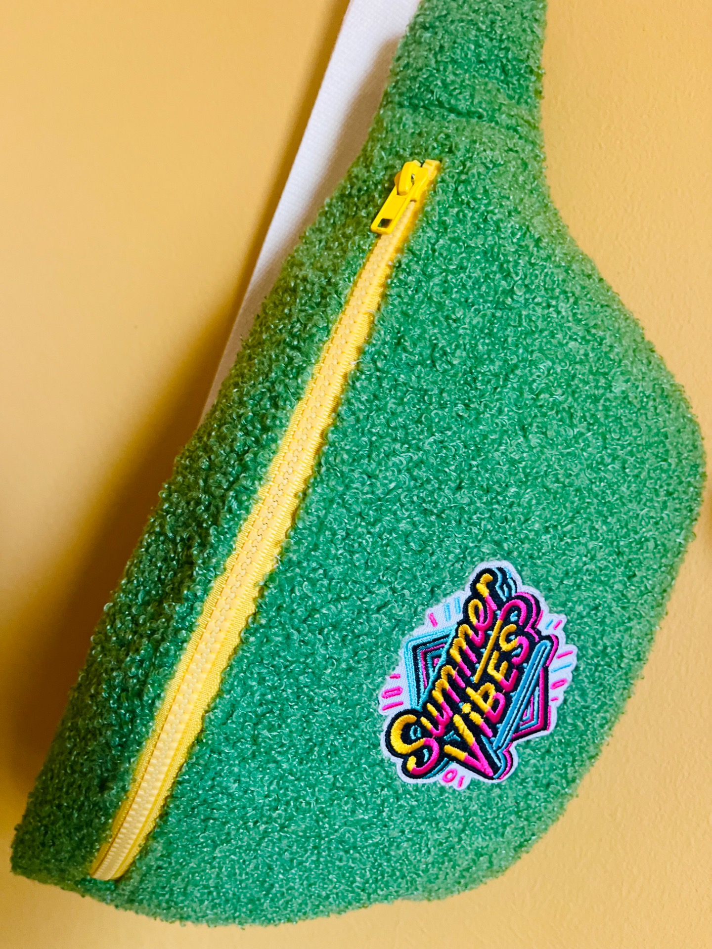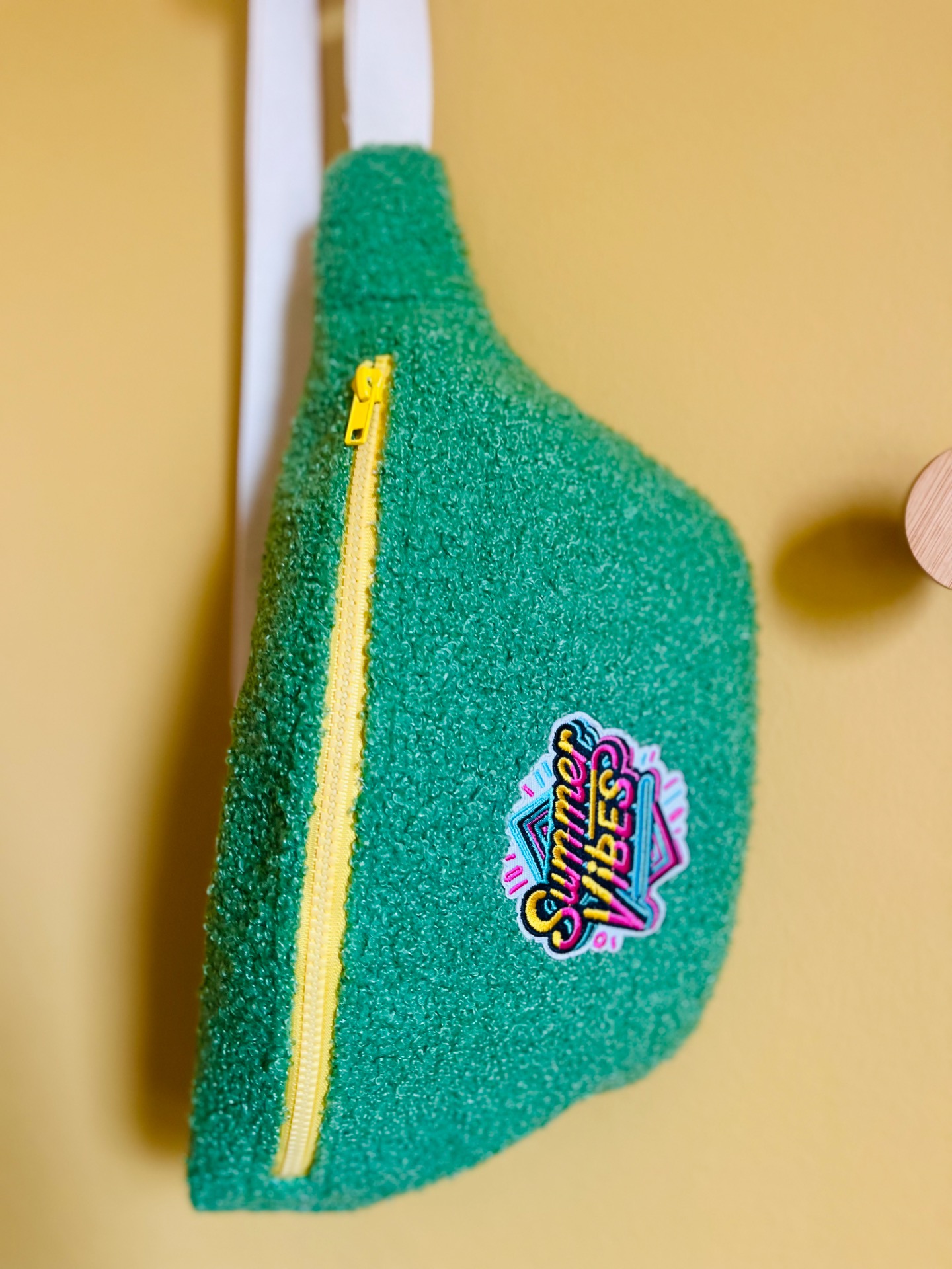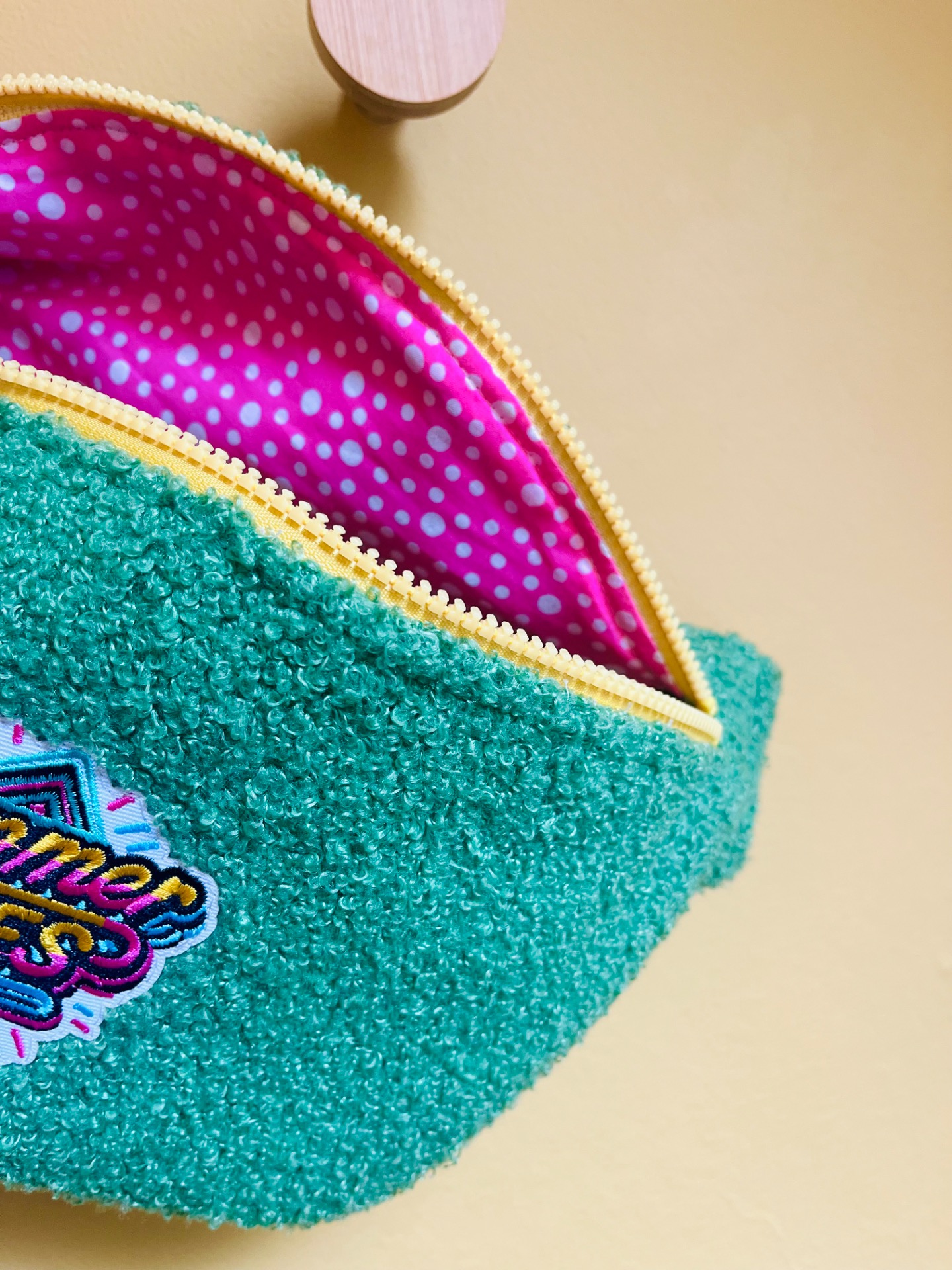 Sac banane en tissu bouclette vert, un look unique et stylé, de jolis détails sur cette banane, une fermeture éclair jaune, doublée d’un tissu rose avec de petits pois blancs, il est stylé même de l’intérieur!