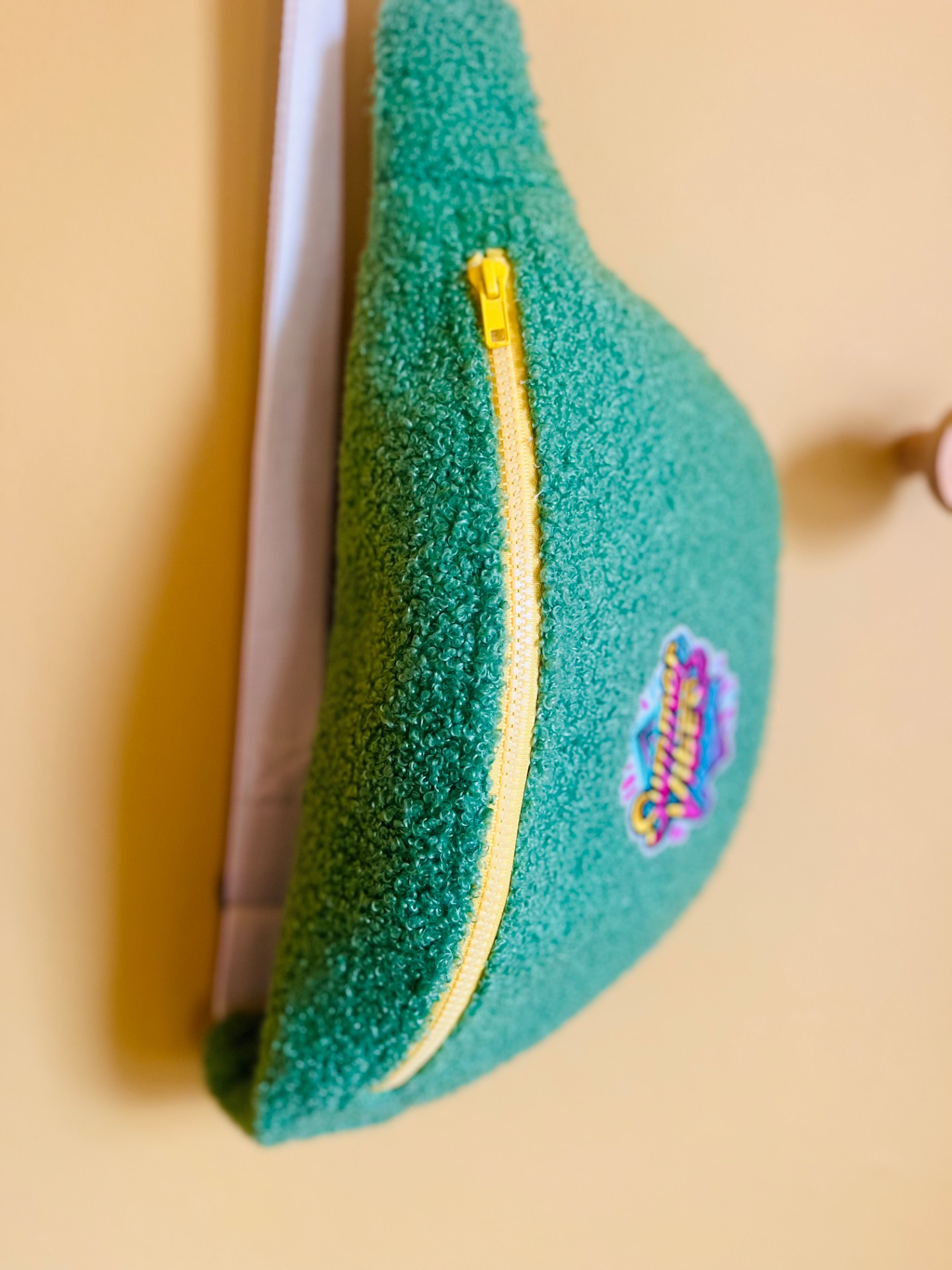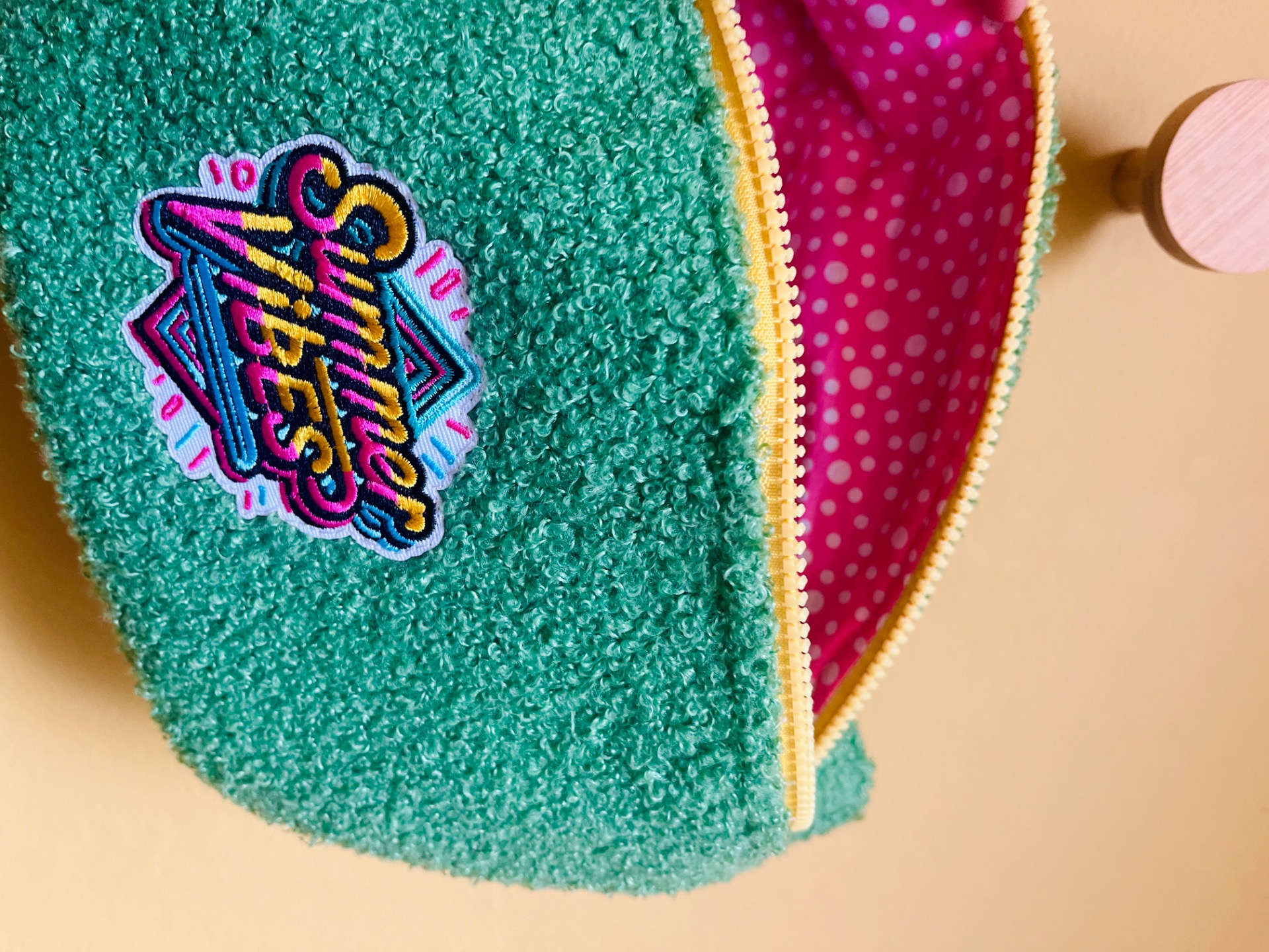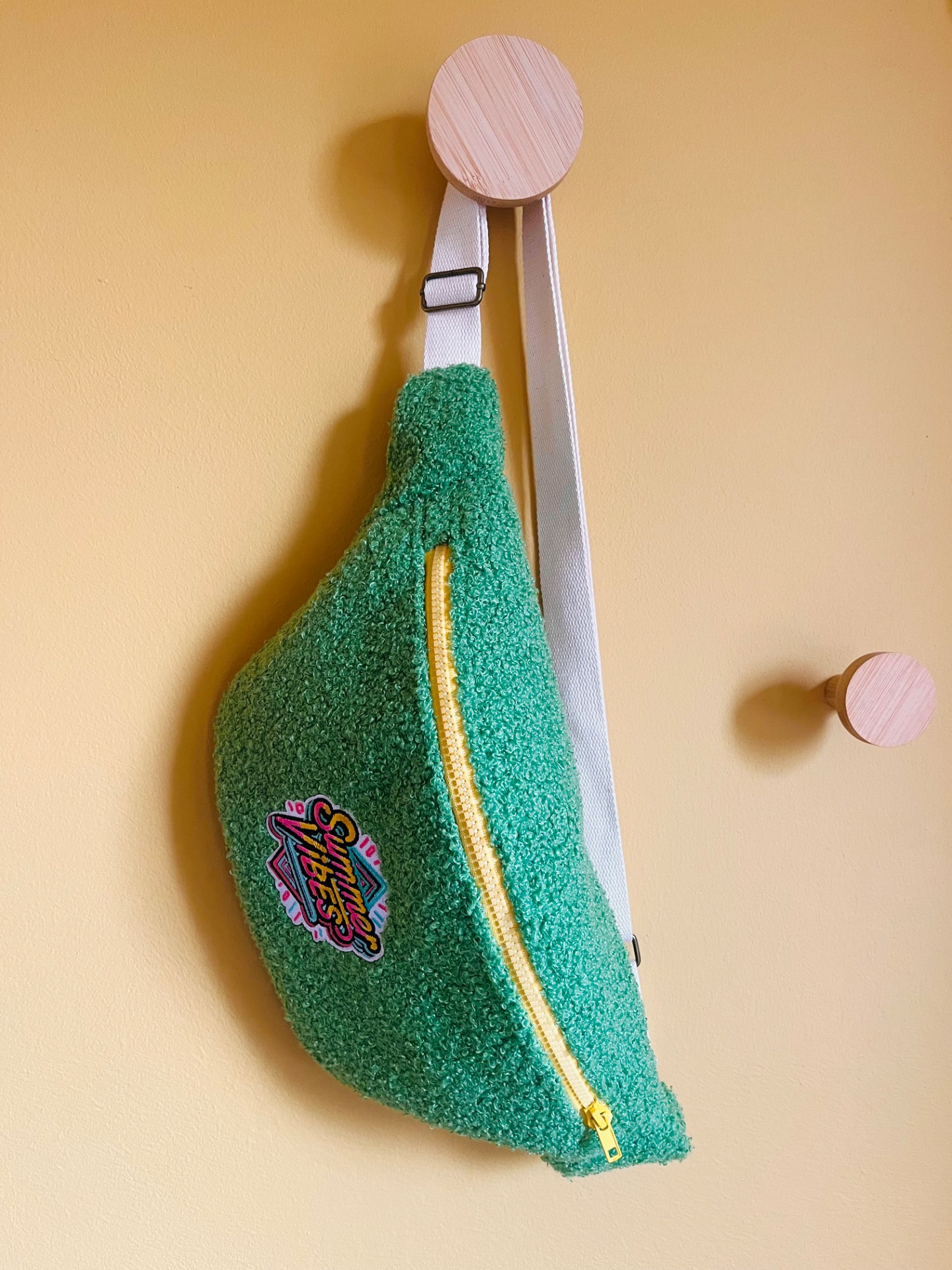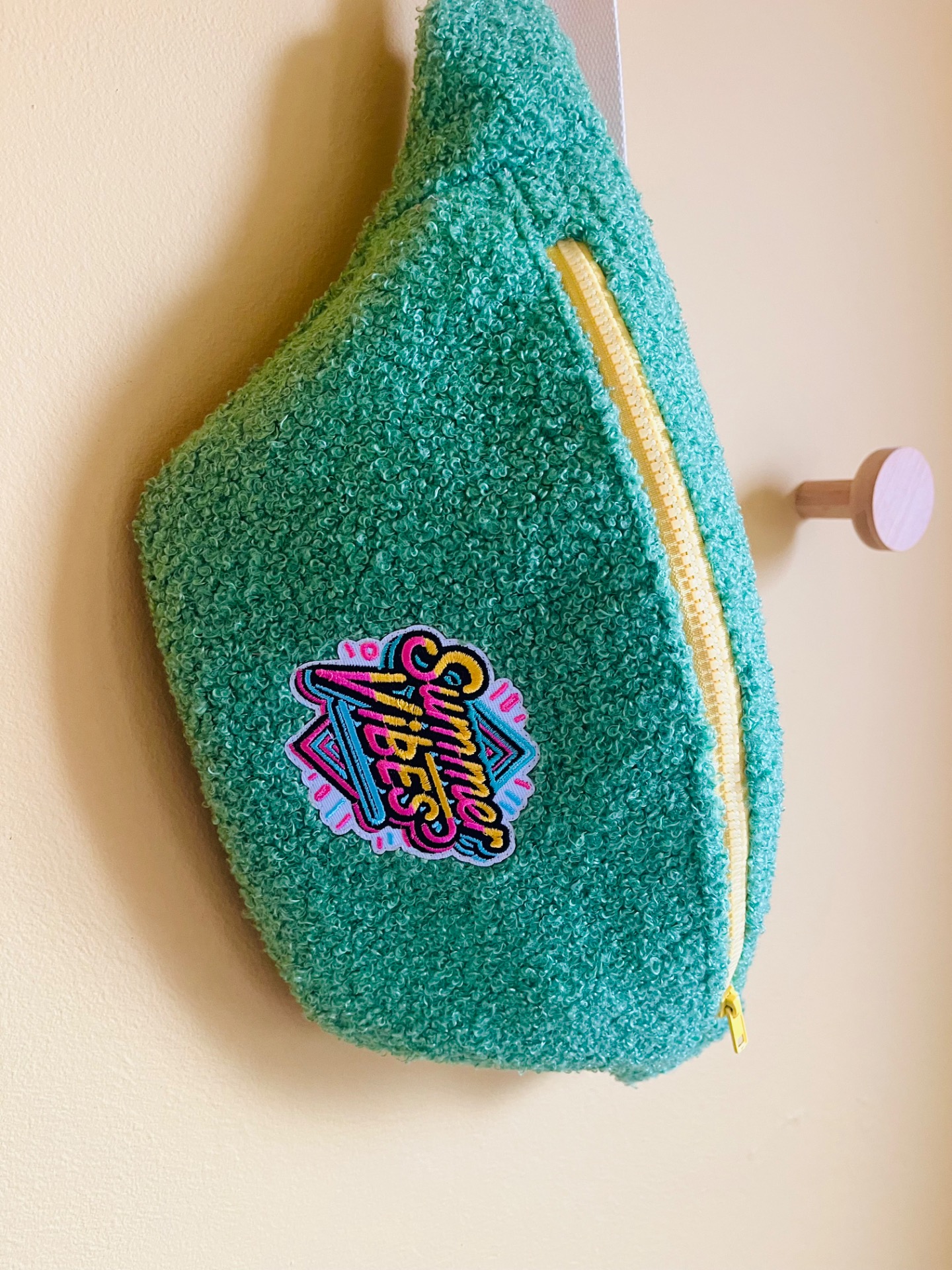 Sac banane en tissu bouclette vert, un look unique et stylé, de jolis détails sur cette banane, une fermeture éclair jaune, doublée d’un tissu rose avec de petits pois blancs, il est stylé même de l’intérieur!