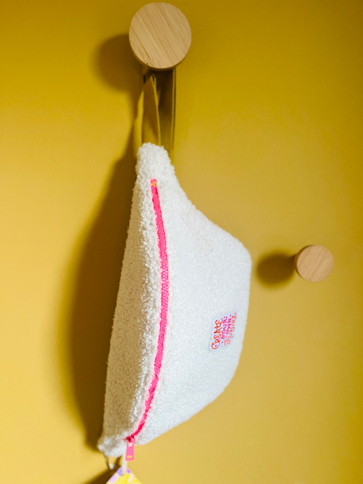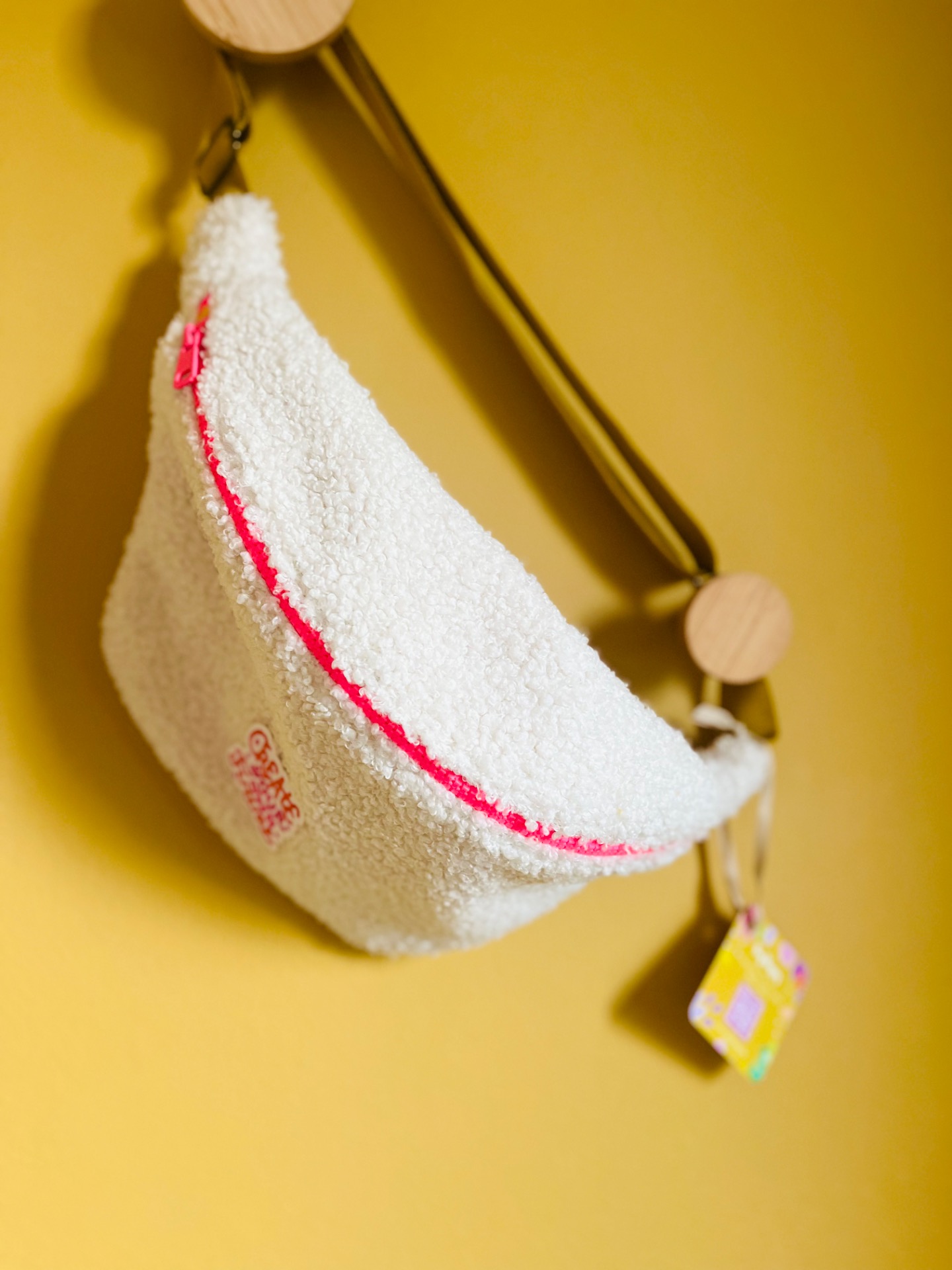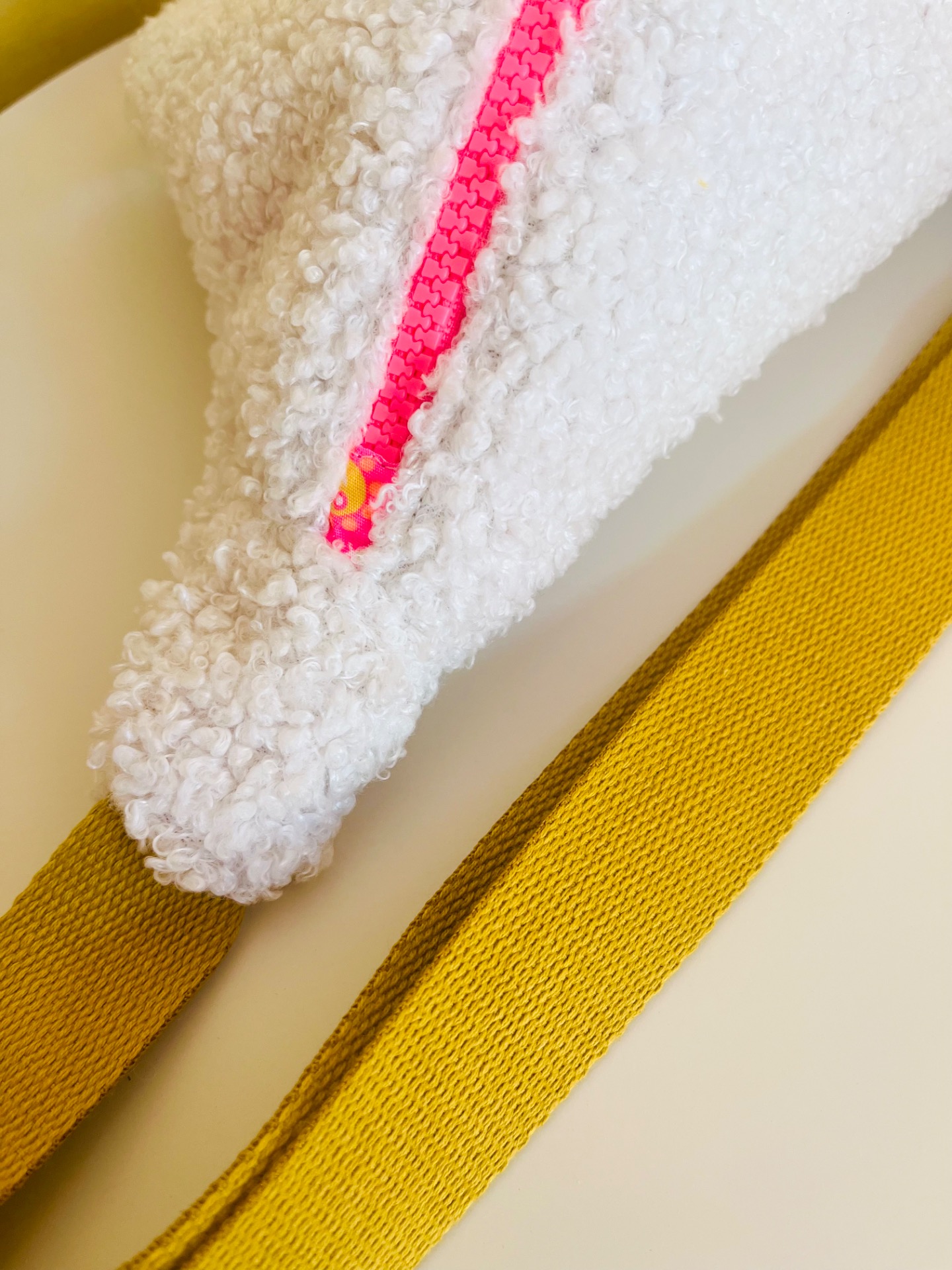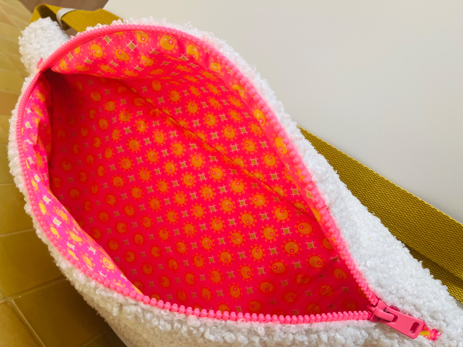 Sac banane en tissu bouclette, un look unique et stylé, de jolis détails sur cette banane, une fermeture éclair rose fluo, doublée d’un tissu petit pan rose fluo avec ses détails jaunes, il est stylé même de l’intérieur!
