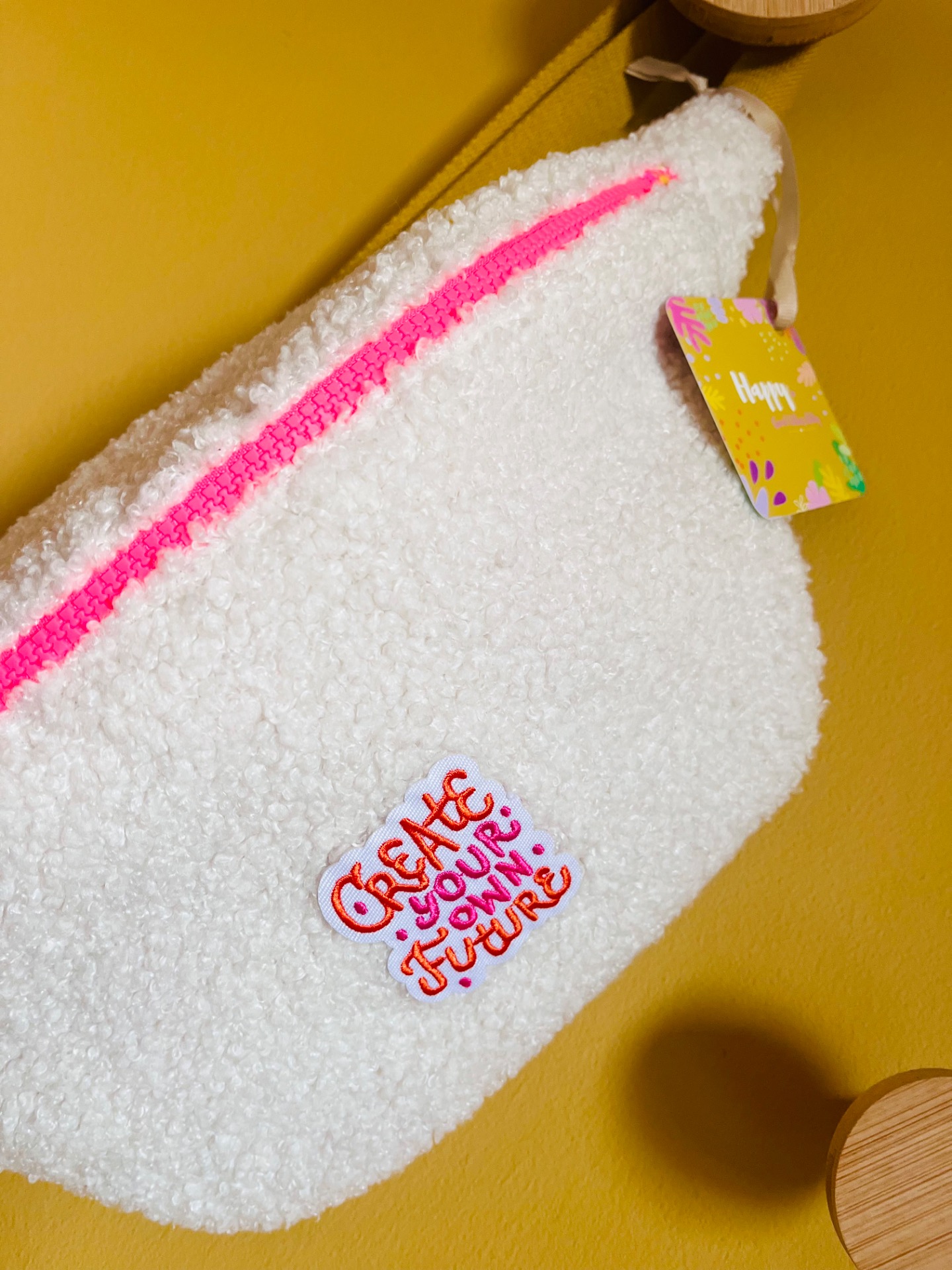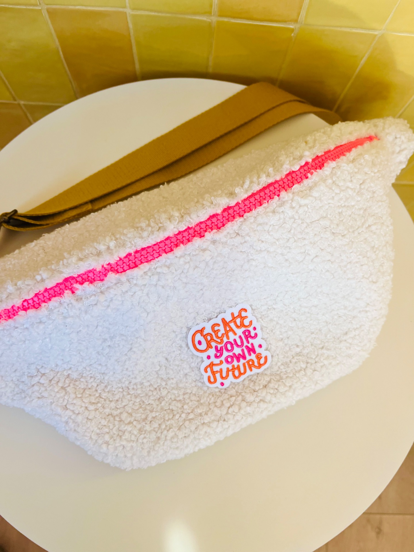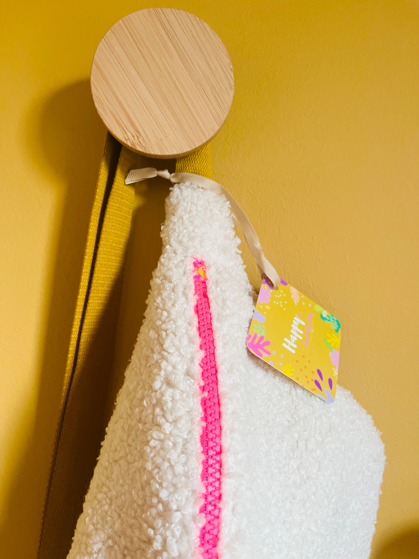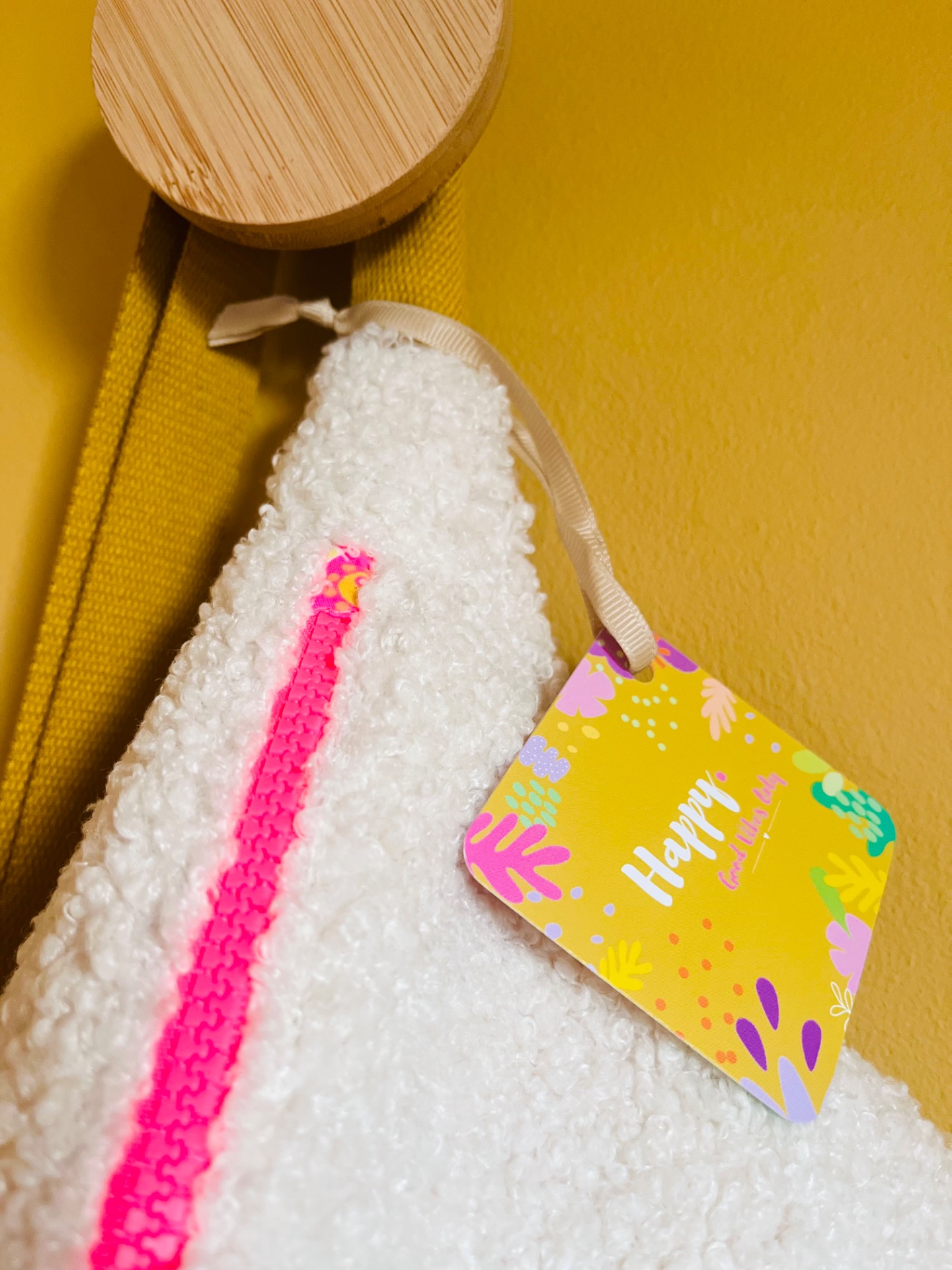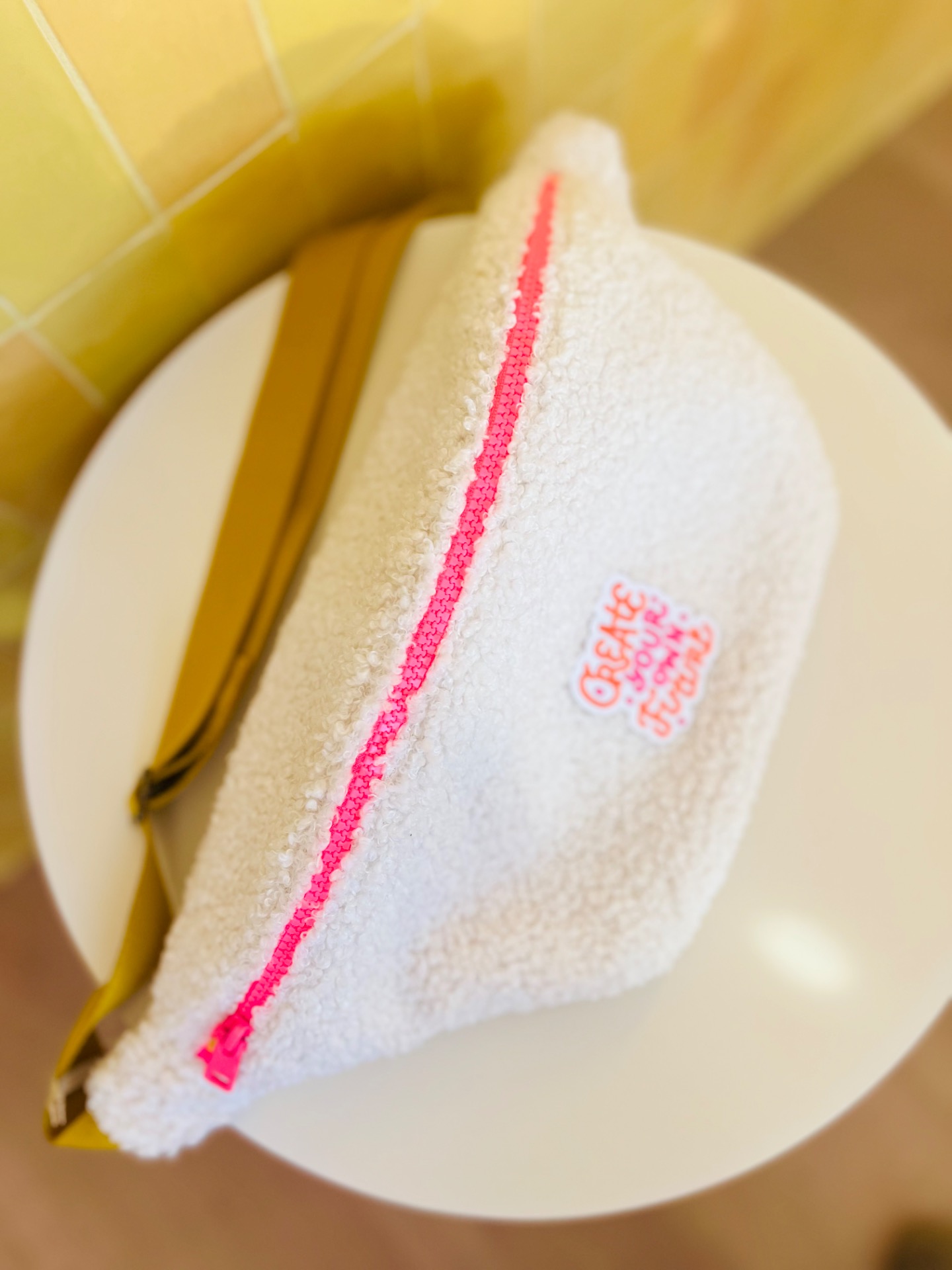 Sac banane en tissu bouclette, un look unique et stylé, de jolis détails sur cette banane, une fermeture éclair rose fluo, doublée d’un tissu petit pan rose fluo avec ses détails jaunes, il est stylé même de l’intérieur!