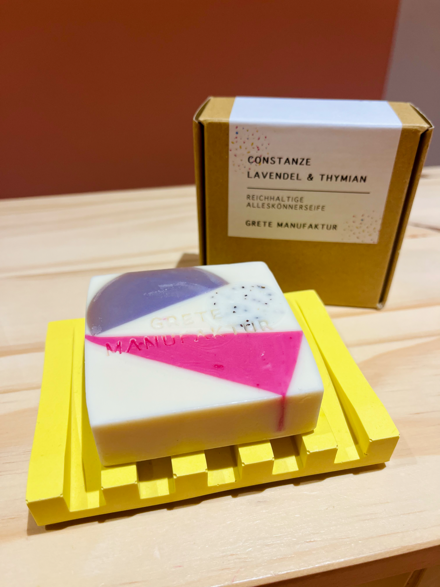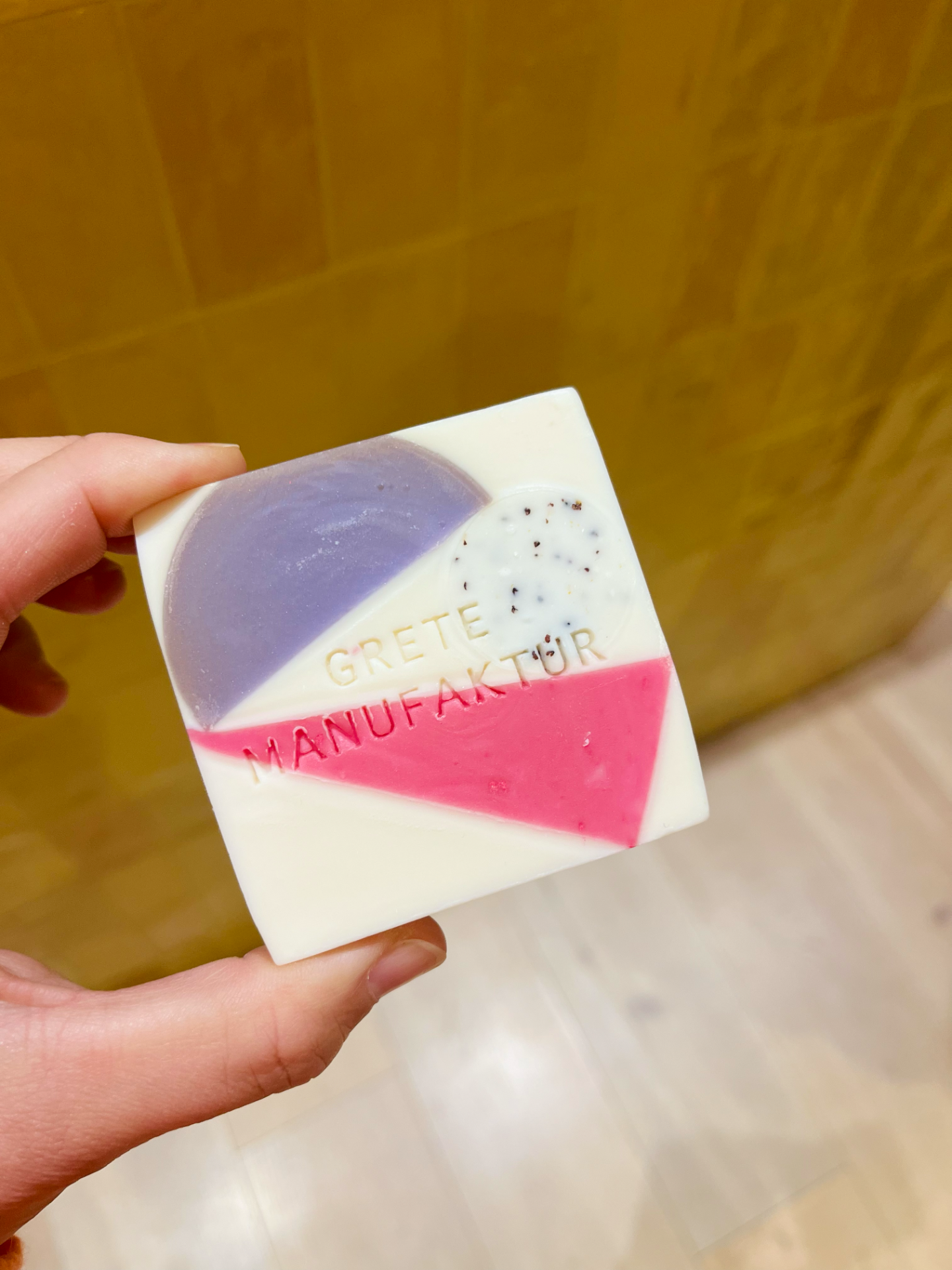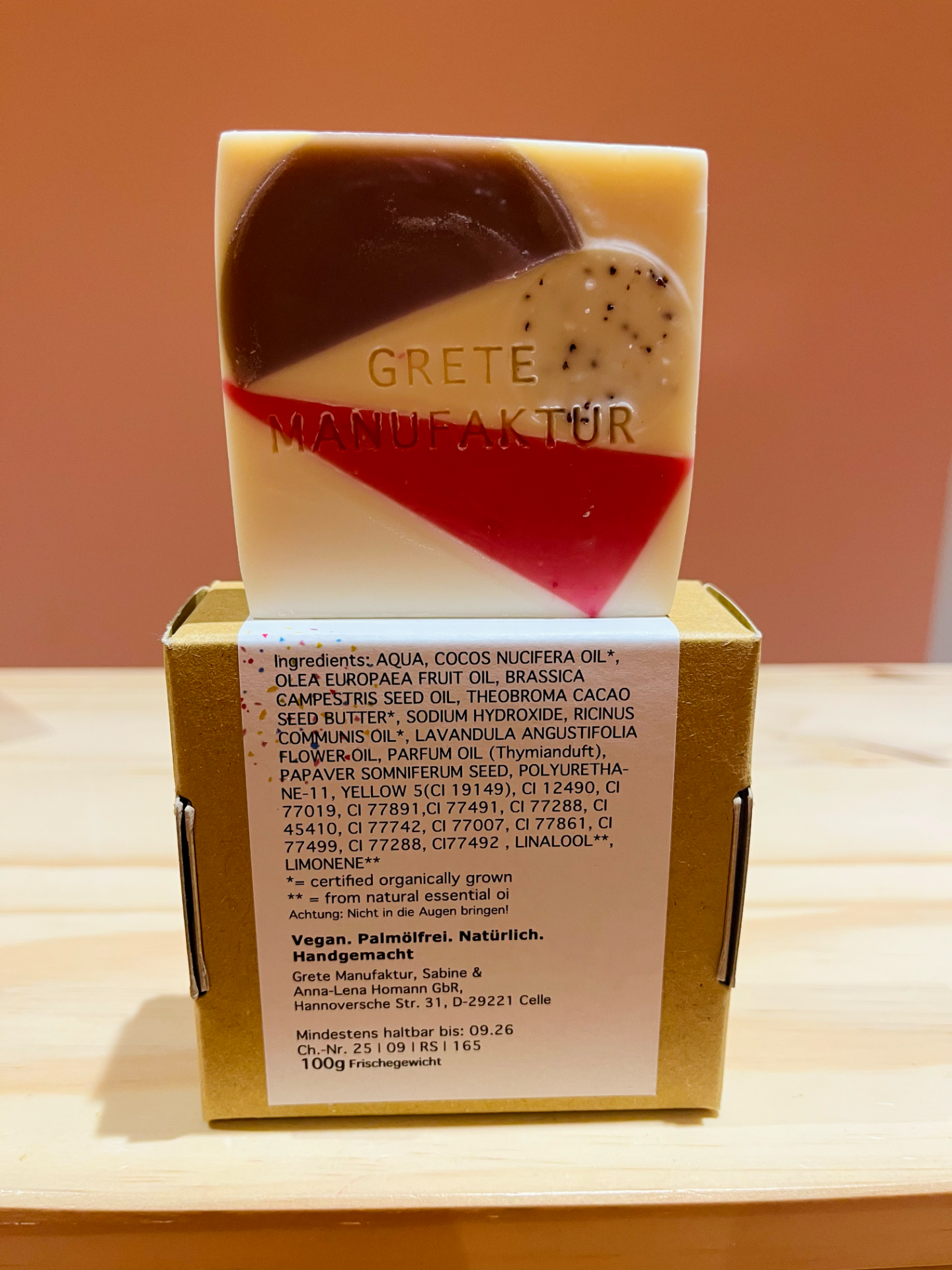 Constanze est enrichie en huile de coco pour une hydratation optimale et contient également du beurre de cacao et de l'huile d'amande douce régénérante. Fabriquée artisanalement avec amour par Grete Manufaktur.