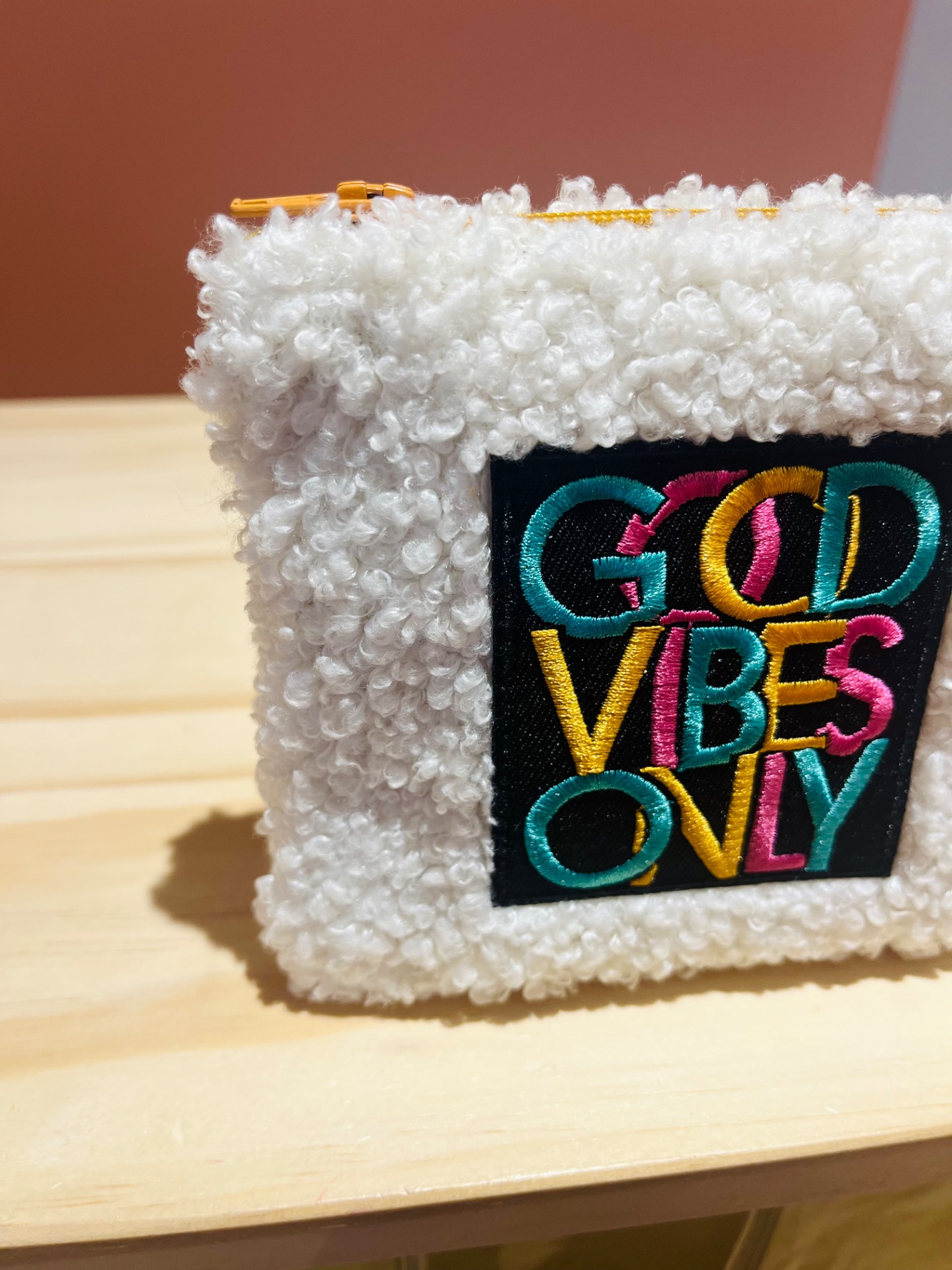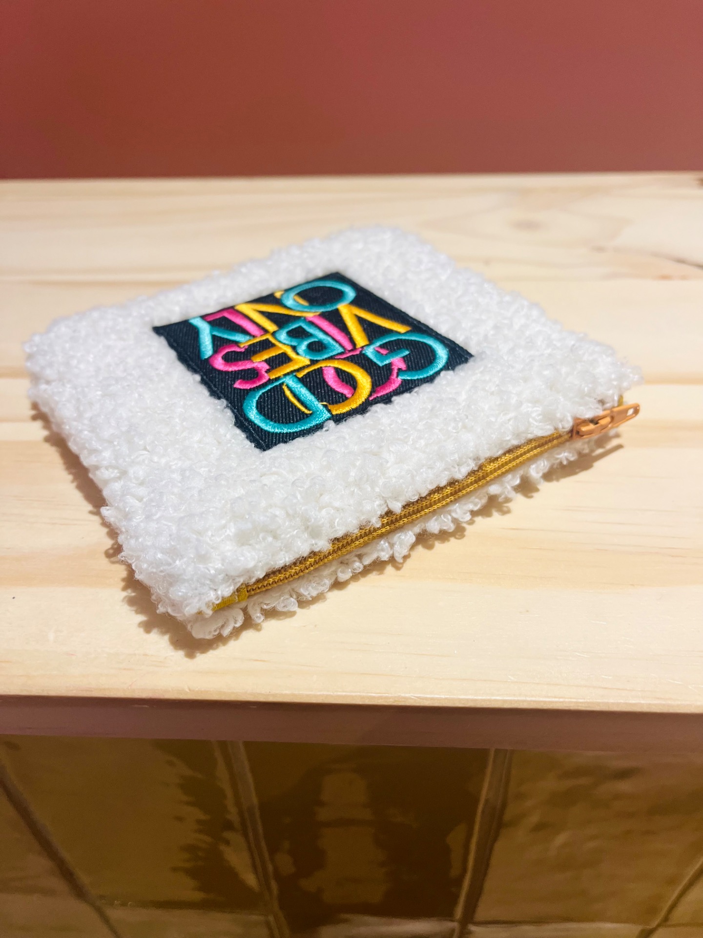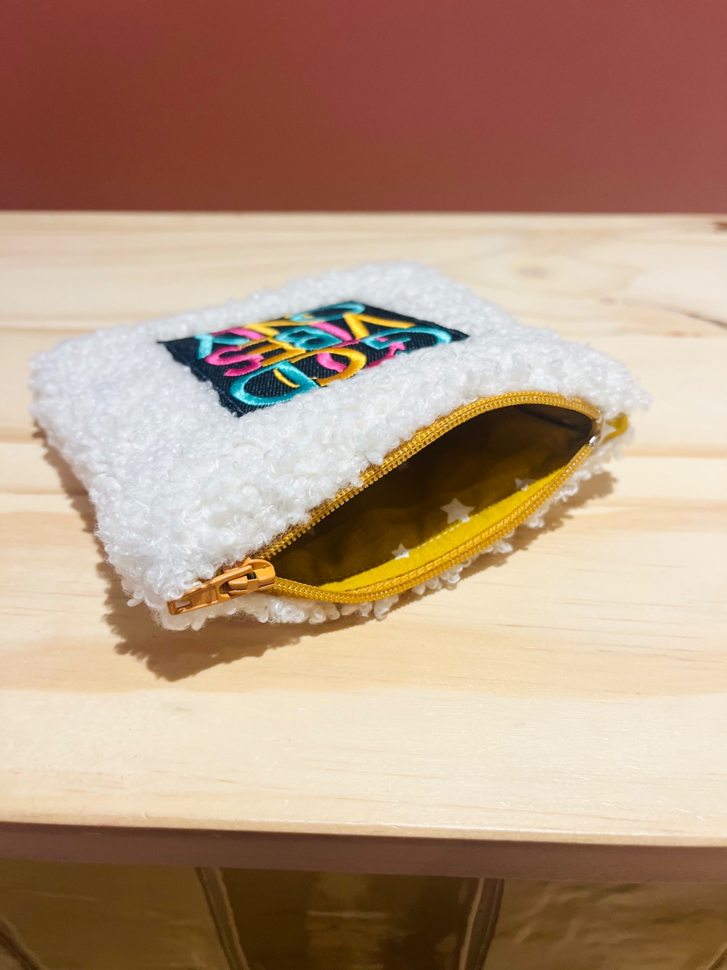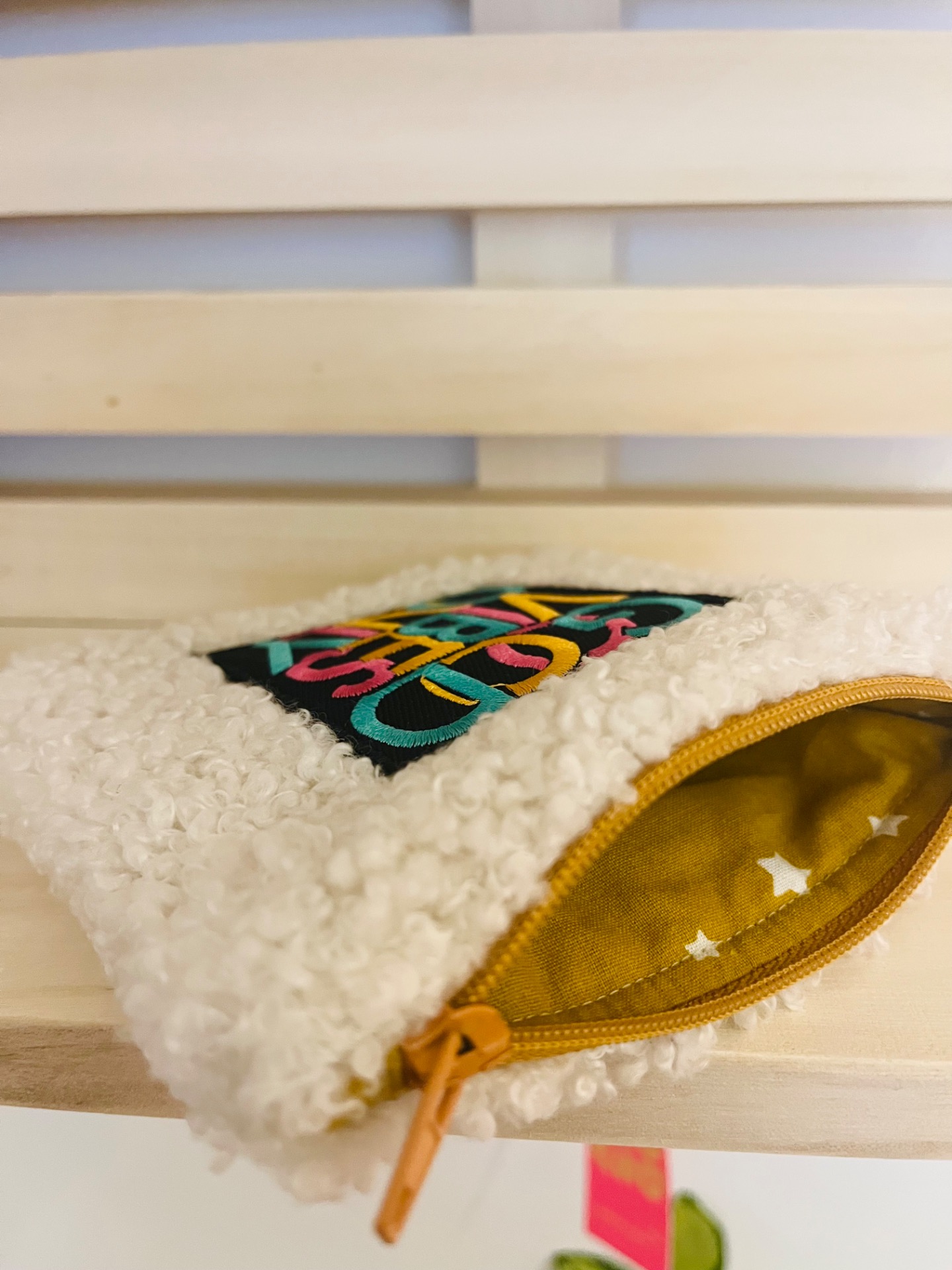 Petite trousse faite à la main avec amour, en tissu sherpa/ teddy, doublée d'un tissu coton coloré et d'une fermeture éclaire, un patch plein de good vibes est collé et cousu dessus.