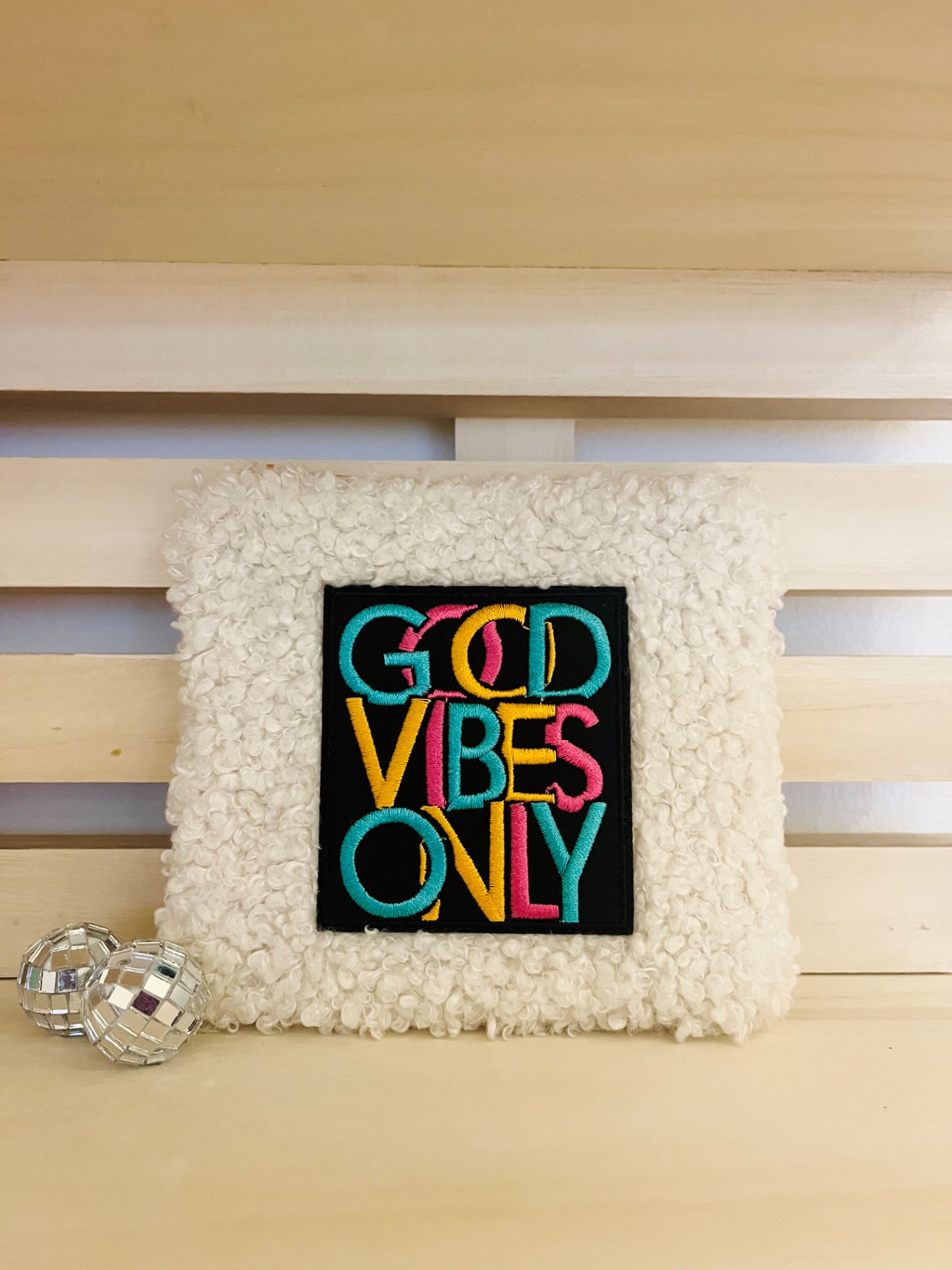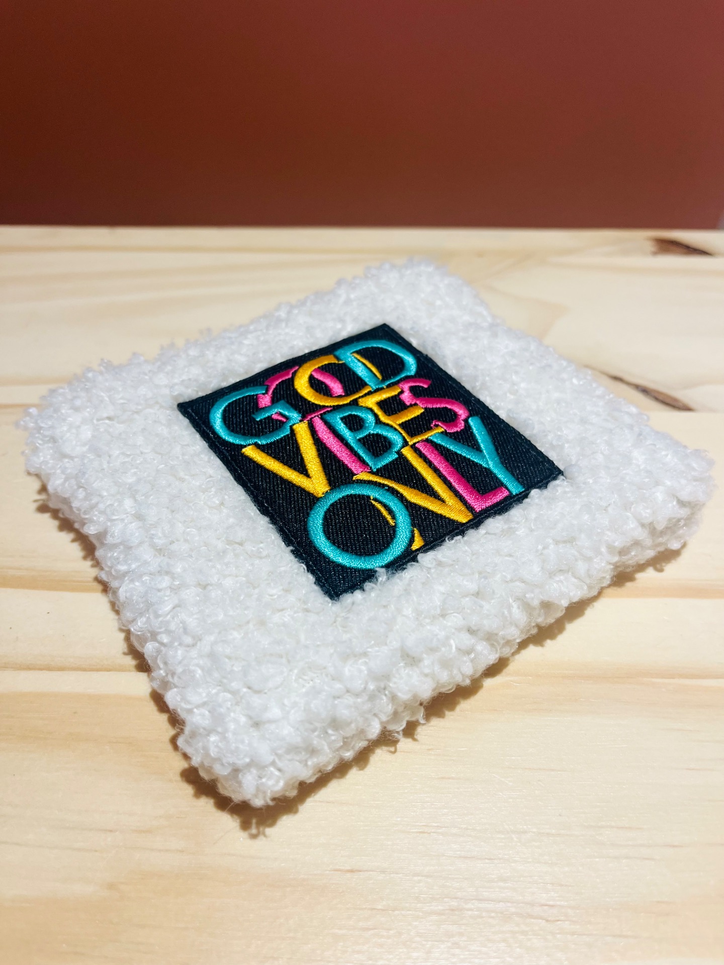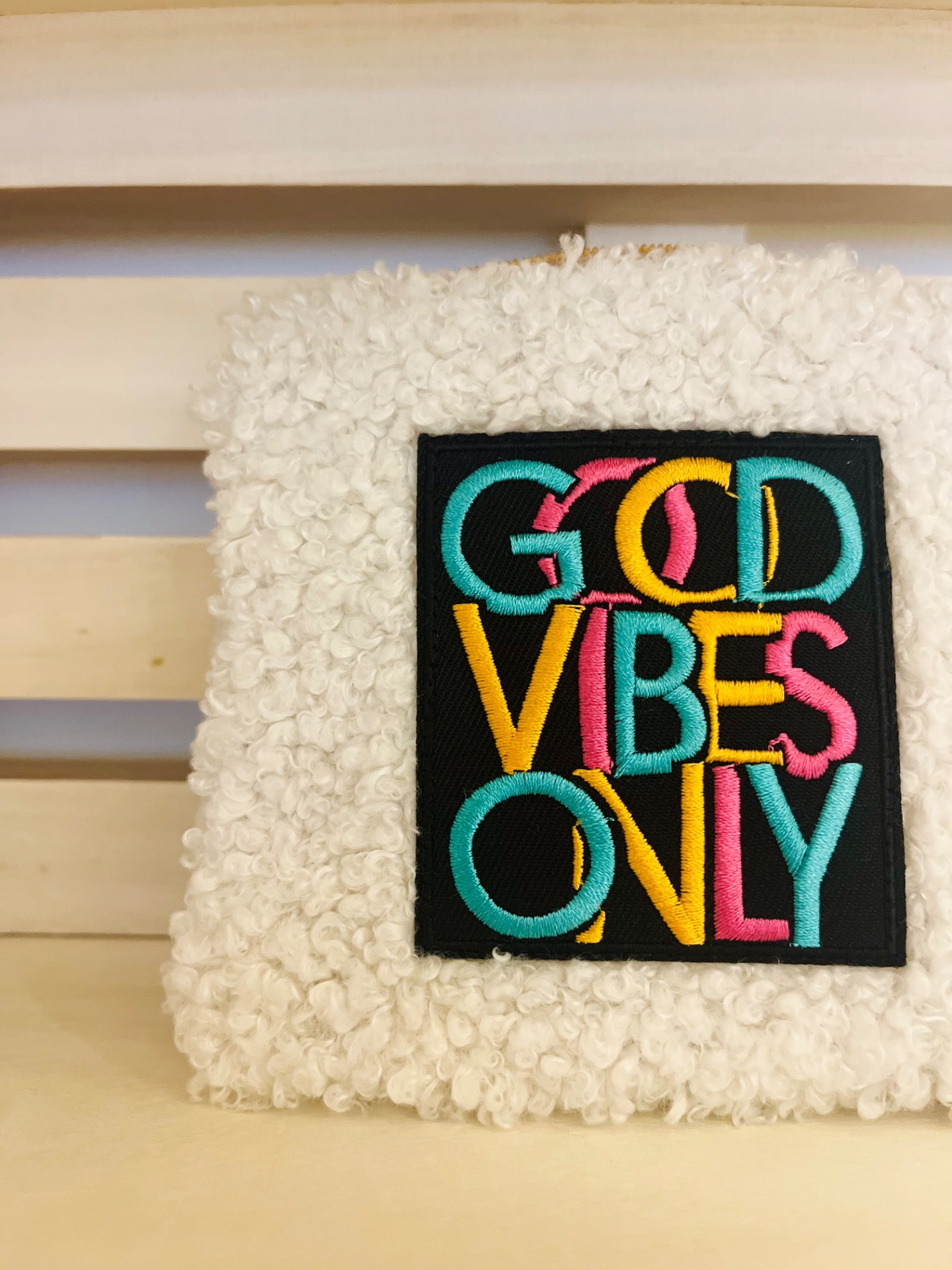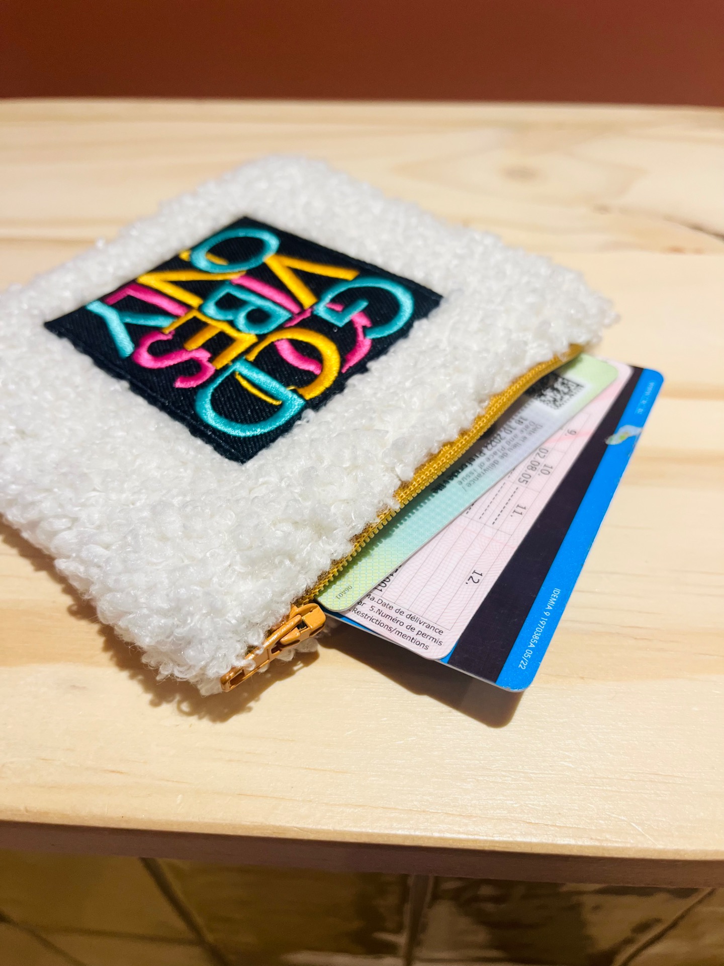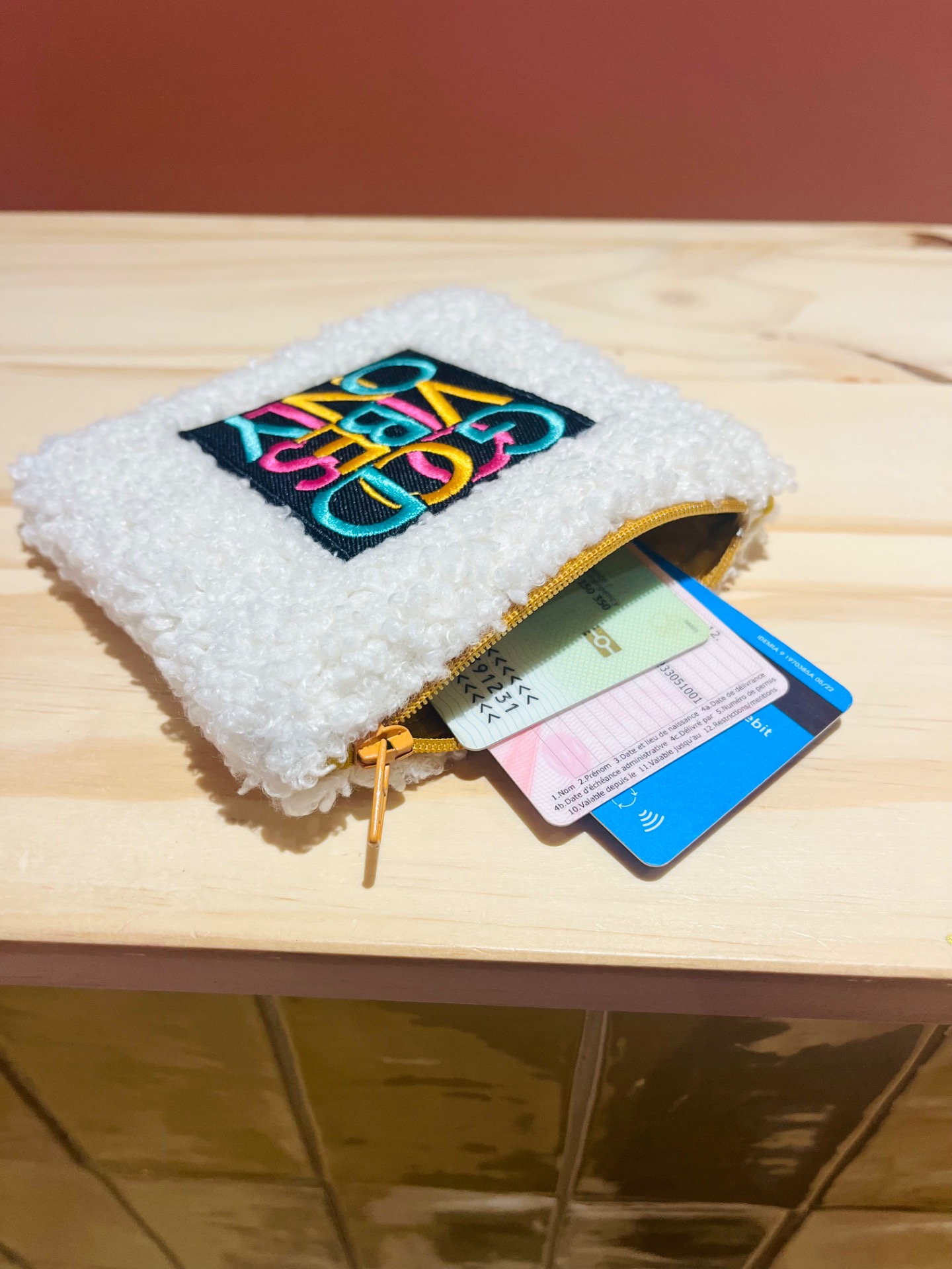 Petite trousse faite à la main avec amour, en tissu sherpa/ teddy, doublée d'un tissu coton coloré et d'une fermeture éclaire, un patch plein de good vibes est collé et cousu dessus.